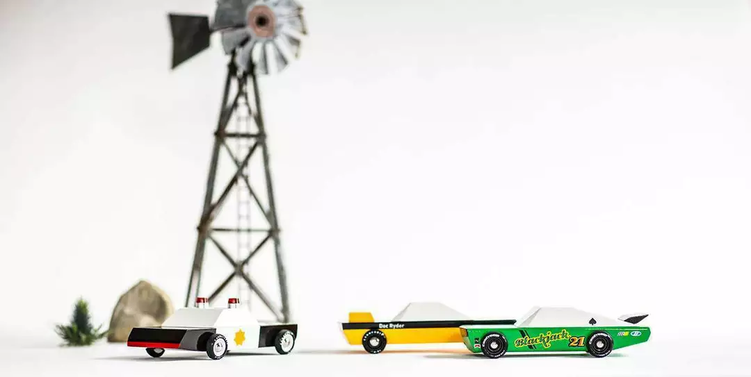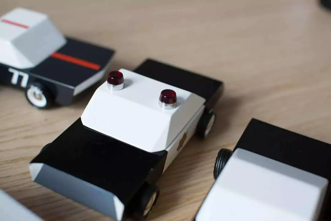 Police Cruiser toy vehicle and collectable by Candylab Toys. There’s no falling out of line when this police car is on duty. The iconic 60’s design is Boxy and assertive. It’s everything you imagine from a classic; shiny black-and-white paint scheme, gold star and two cherries on top. Making sure racing stays at the track and the law is upheld.