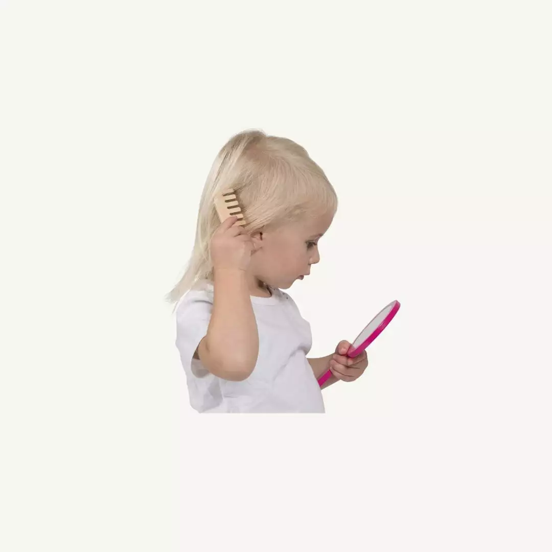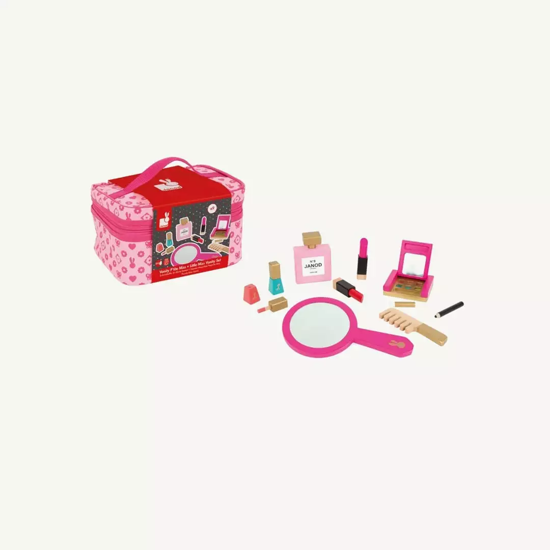 Little Miss Vanity Case by Janod. Children love to watch and copy grown ups and this lovely vanity case is great for role play and imaginative play. It comes everything needed to become the prettiest ‘Little Miss’, including 9 wooden accessories: a large mirror, a makeup palette with brush and built-in mirror, 2 lipsticks, 2 nail varnishes, 1 eyeliner pencil, 1 perfume bottle, 1 brush.
