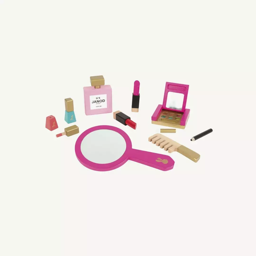 - 9 wooden accessories: large mirror, makeup palette with brush and built-in mirror, 2 lipsticks, 2 nail varnishes, 1 eyeliner pencil, 1 perfume bottle, 1 brush