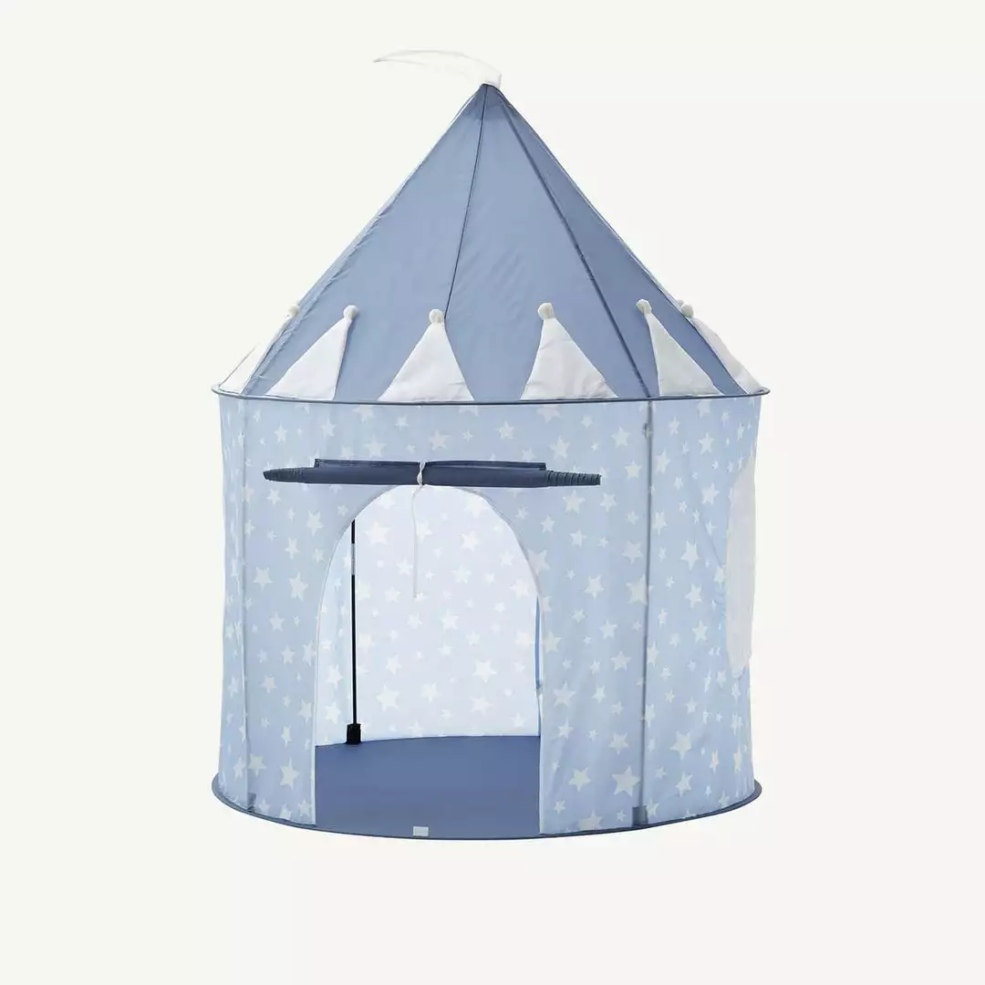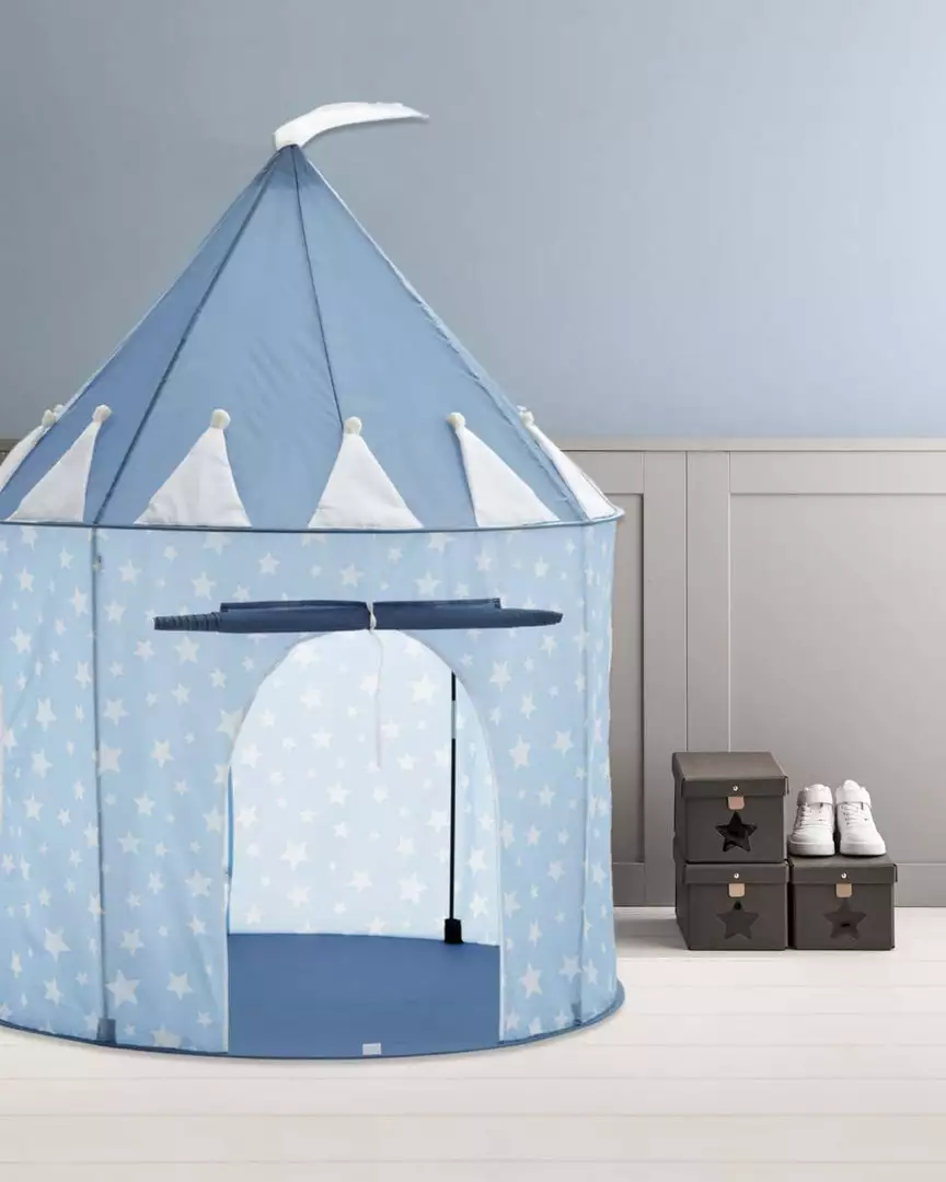 Kids Concept Star Blue Play Tent Our beautiful Star Play Tents the perfect place for your little Princes and Princesses to escape and one of our most popular gifts for young children. Quick and easy to assemble, they come with a convenient carry case, perfect for taking on sleepovers! The door curtain can be rolled up, making their play space larger so when their friends or family come to play, there’s plenty of room for everyone.