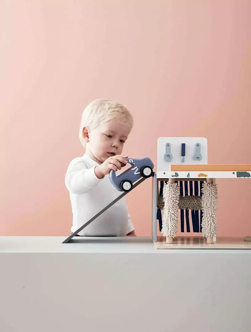 AIDEN 3 in One Wooden Toy Service Centre by Kid’s Concept. Designed in Scandinavia and beautifully handcrafted in wood, this fantastic Wooden Toy Service Centre features Repair Shop, Car Wash and Gas station. It’s your automotive one-stop play and fits all of our Kids Concept Aiden Car collection.