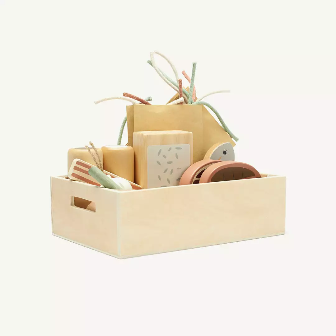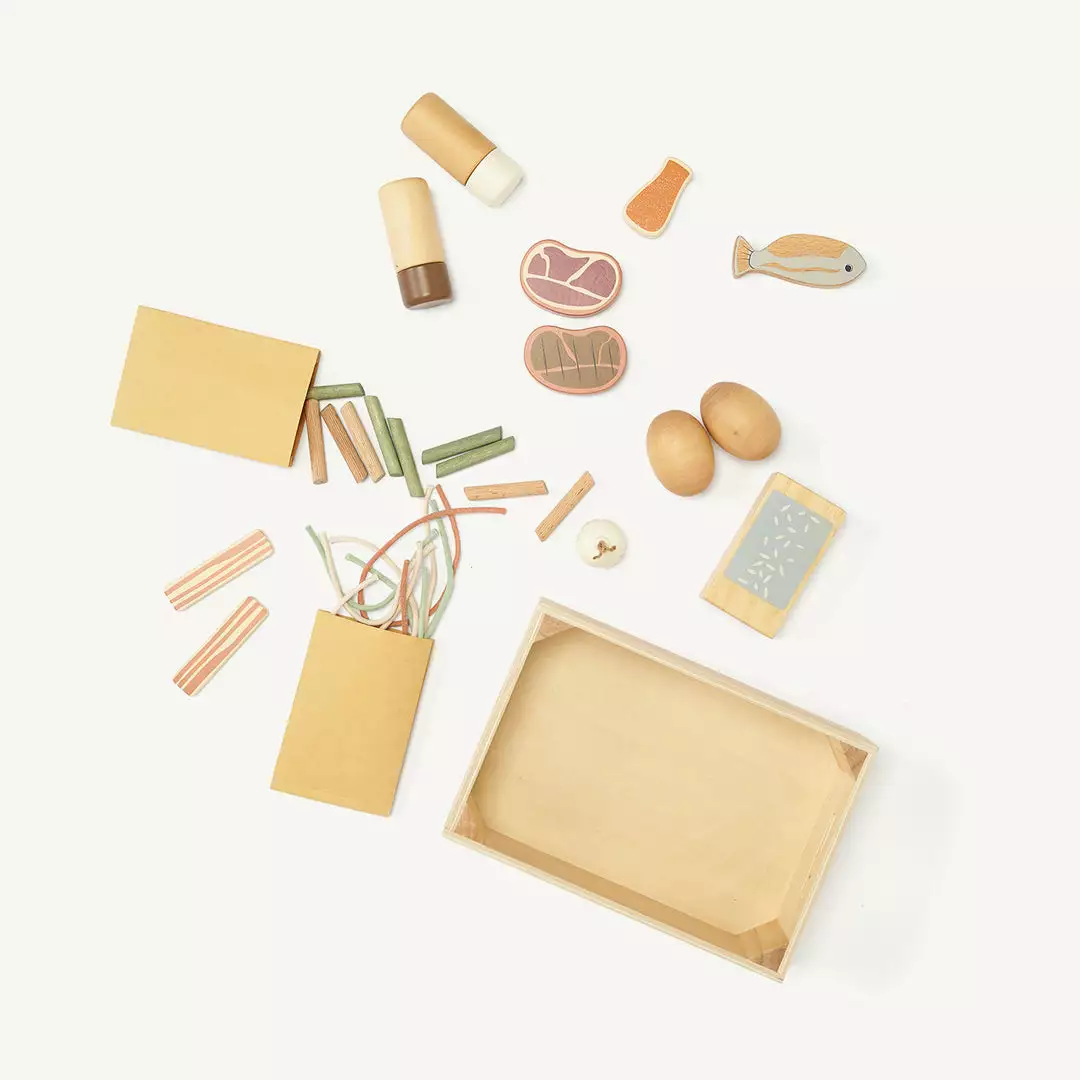 The set also contains salt and pepper shakers that click when you turn them. The pasta or other play food can be stored in the two paper bags provided. All accessories come in a wooden box.Â