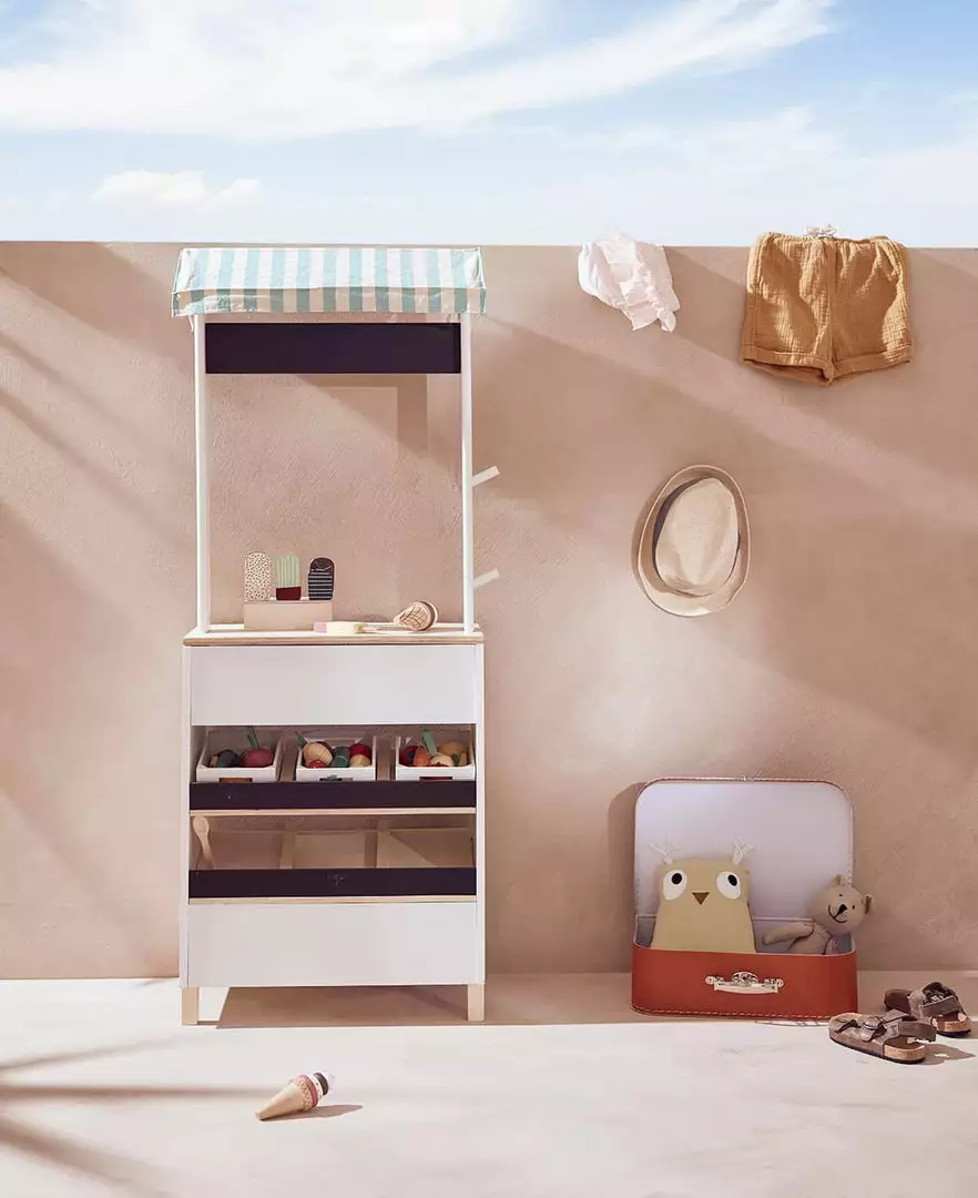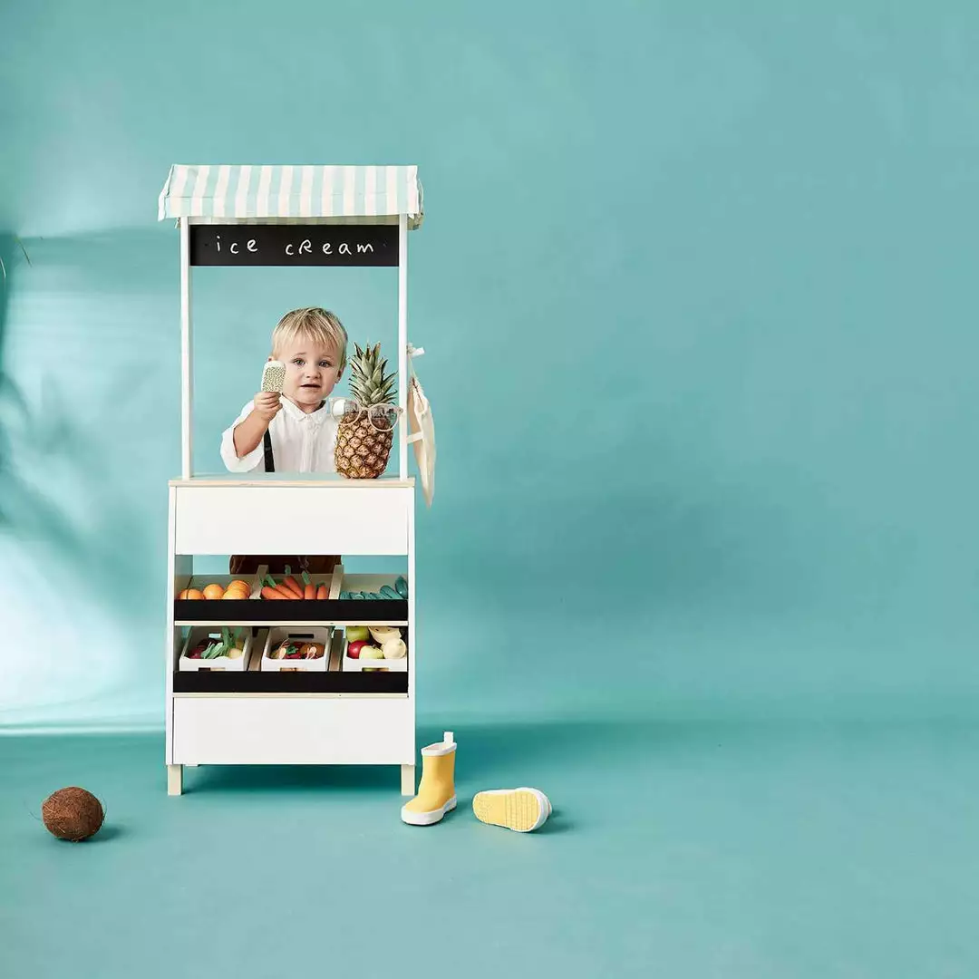 Wooden Toy Market Stand by Kid’s Concept. This fabulous wooden toy market stand is a lovely addition to any playroom and guaranteed to provide hours of fun. The soft neutral tones are a big hit with parents too, a long shelf life toy that’s soft on the eye in a modern home, even out of the playroom.Â