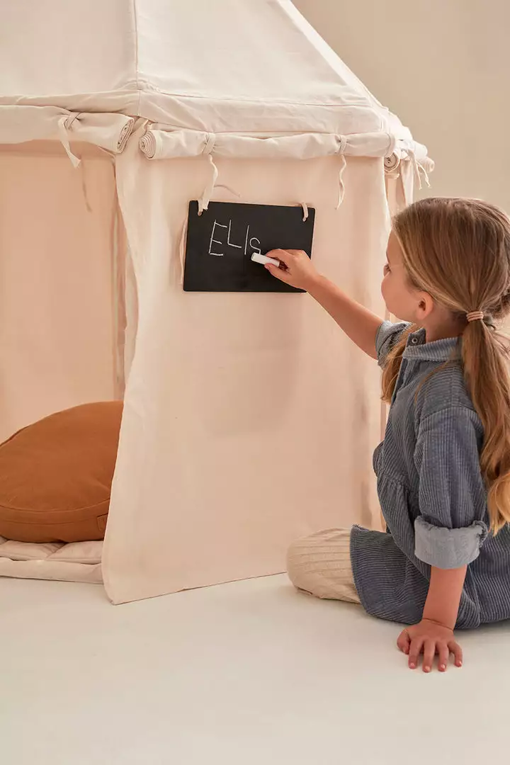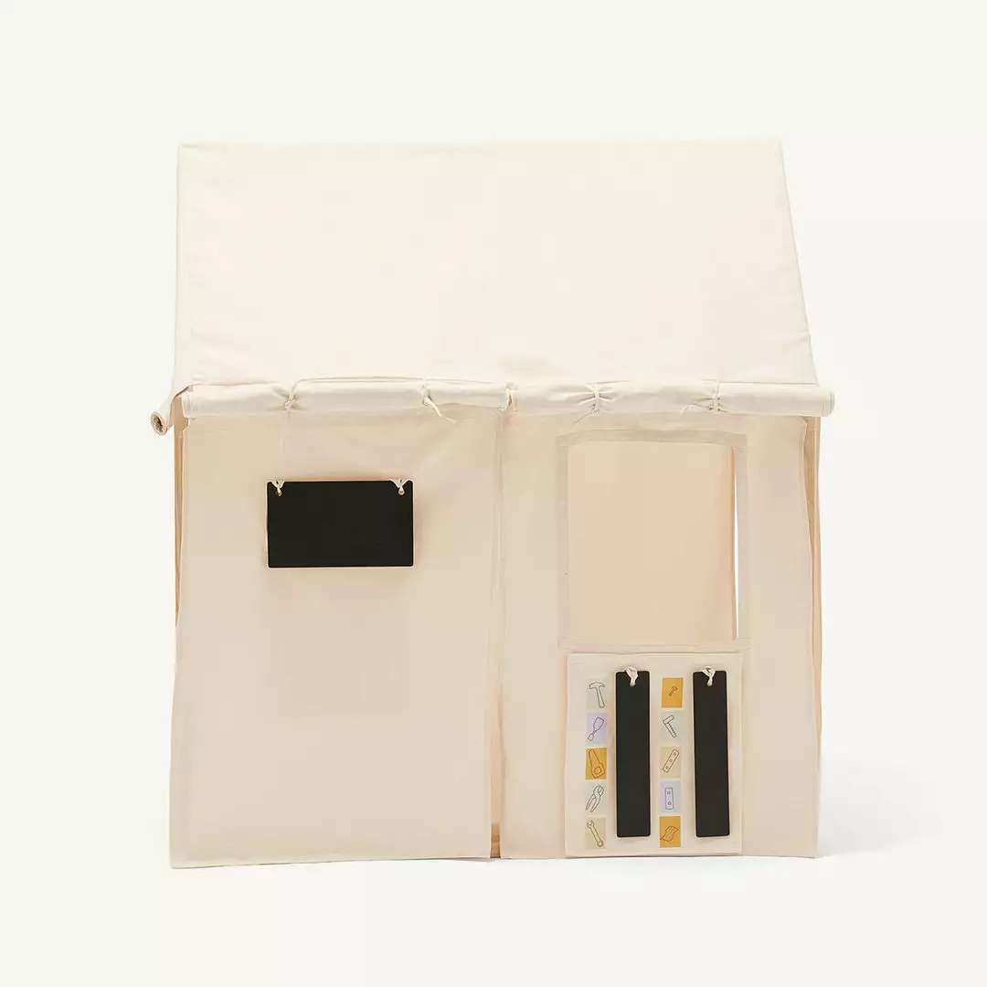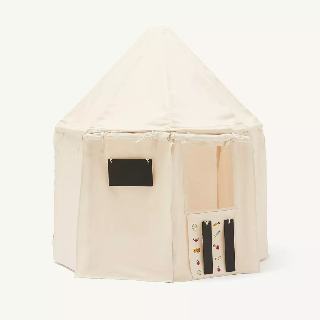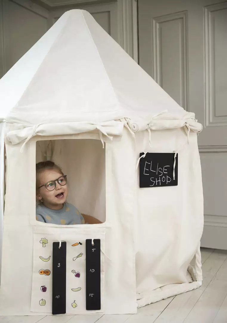 KID’S HUB Tent Add On Play Set by Kid’s Concept. The perfect addition to our best selling Kid’s Concept Play House and Pavilion Tents (pictured). With the add-on tent, you can choose the business of the day. Do you want to run a restaurant or a yoga studio? Maybe you’d rather sell vegetables or hard wear? Only the imagination can stop the little entrepreneur with this add-on play set. Attaching the add-on is quick and easy. Simply roll up the existing tent cloth and add the parts in the package. Choose between the included menus and attach them to the blackboards. Voila! The tent becomes a restaurant or a café. The package contains menus for a restaurant/café, a shop, a greengrocer, and a spa. The fabric matches our Kid’s Concept off-white tents and tunnels.