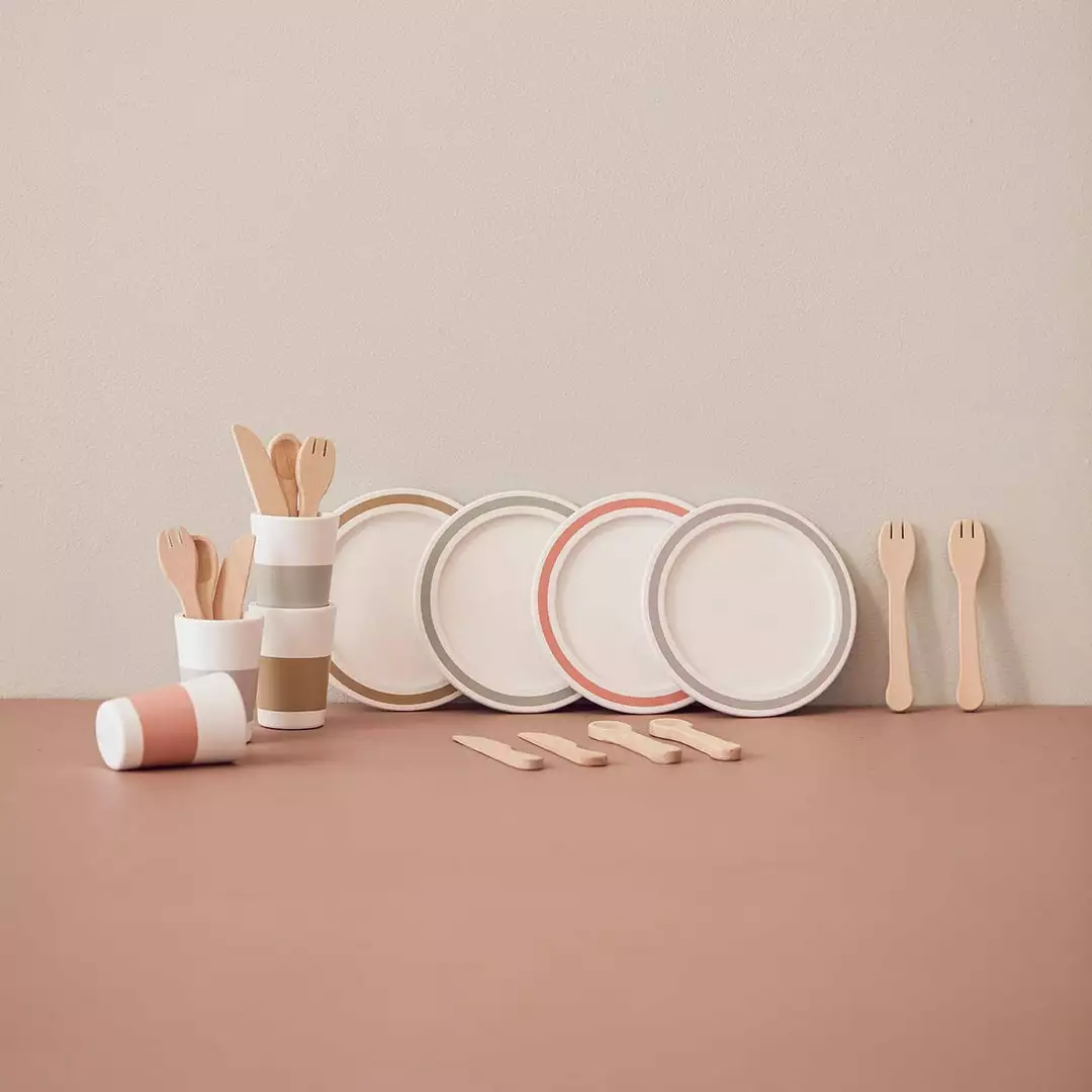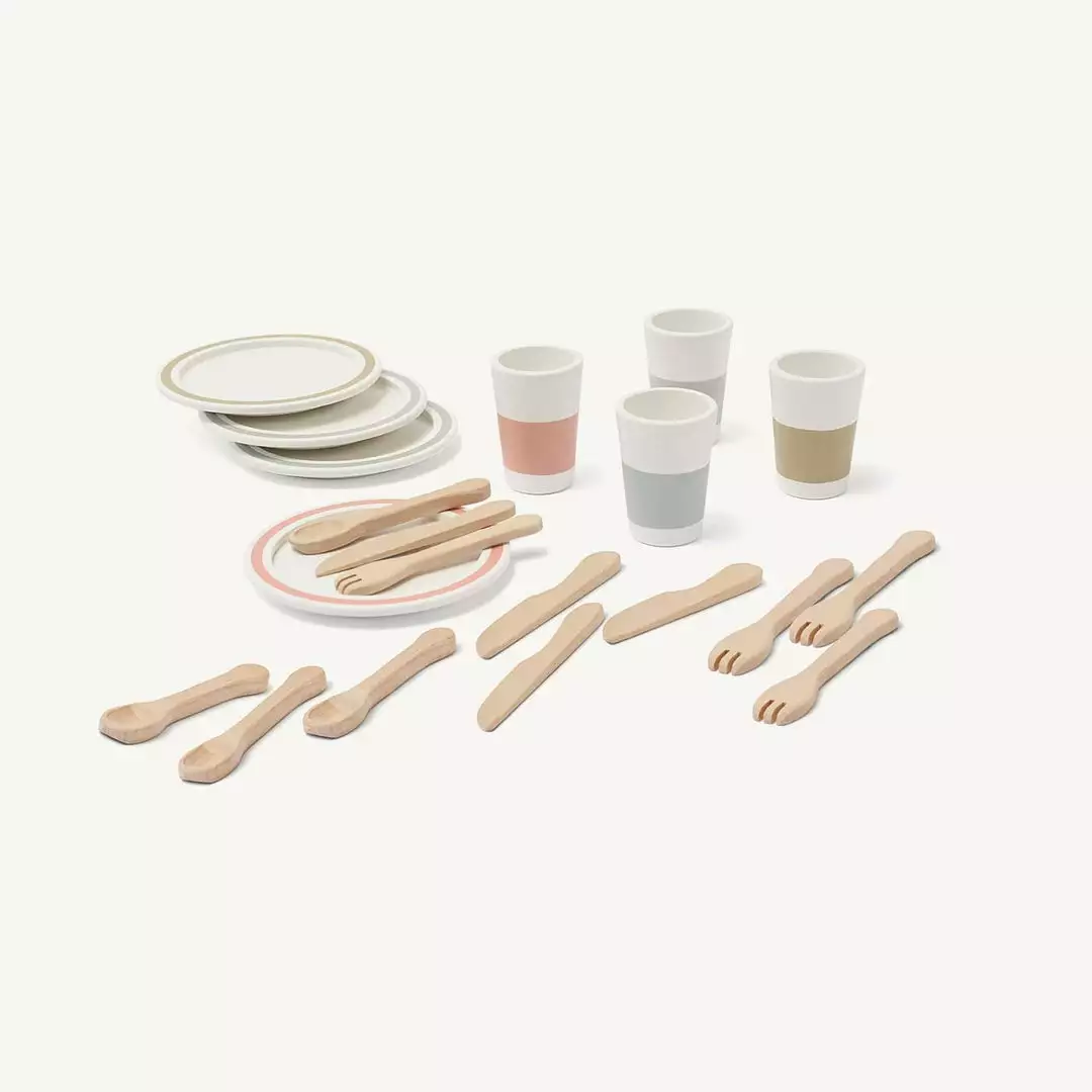 Bistro Dinnerware Play Set by Kid’s Concept. The dinner is ready! A complete wooden play dinner ware set for 4 with 20 pieces. The set comes supplied with 4 wooden plates, 4 cups, 4 knives, forks and spoons – making it a great addition to any wooden play kitchen. Producing hours of play time fun and endless play possibilities. The wooden dinner ware set is a great way to encourage imaginative and creative role play sessions.
