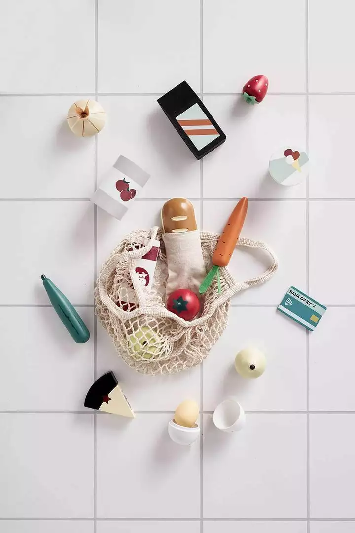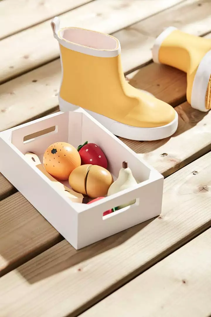 Wooden Toy Mixed Fruit Box by Kid’s Concept. Designed in Scandinavia and beautifully handcrafted in wood, this lovely white wooden vegetable box comes with all your favourite fruit including strawberries, banana, lemon, apple pear and oranges. The lemon can be divided into two and put together again with velcro so your little ones can practice preparing their fruit.Â