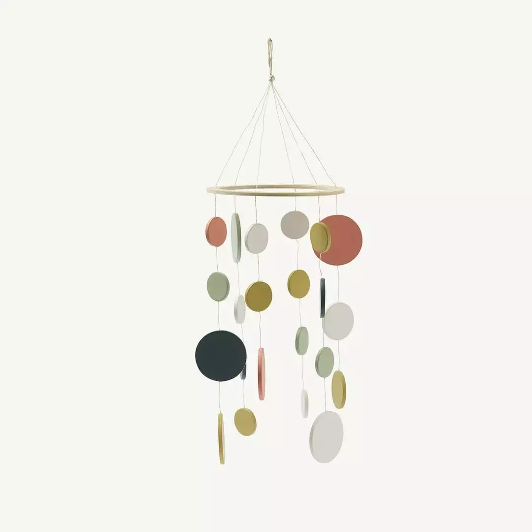 Wooden Baby Mobile by Kid’s Concept. This beautiful decorative wooden mobile in green and blue tones is an adorable accessory for your child’s nursery. Babies love to watch the colourful circles and they gently spin and sway above them. The mobile can be hung above a cot or changing station and is perfect for keeping babies entertained during nappy changes as well as developing their senses. Â