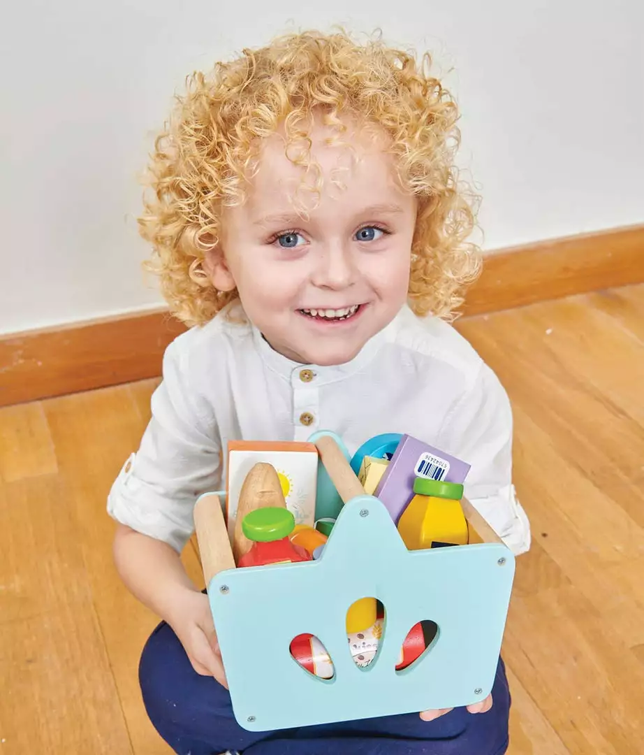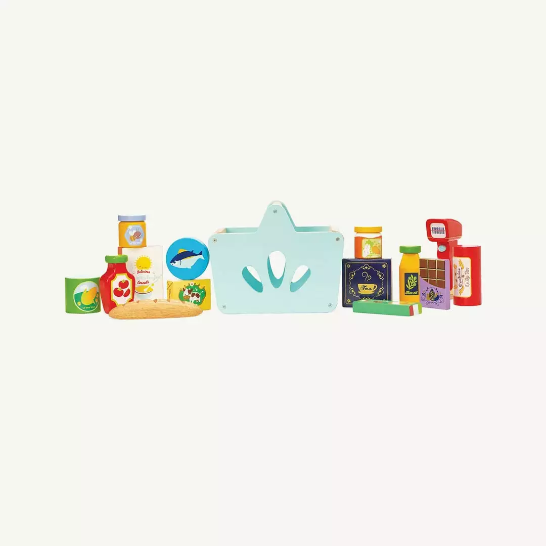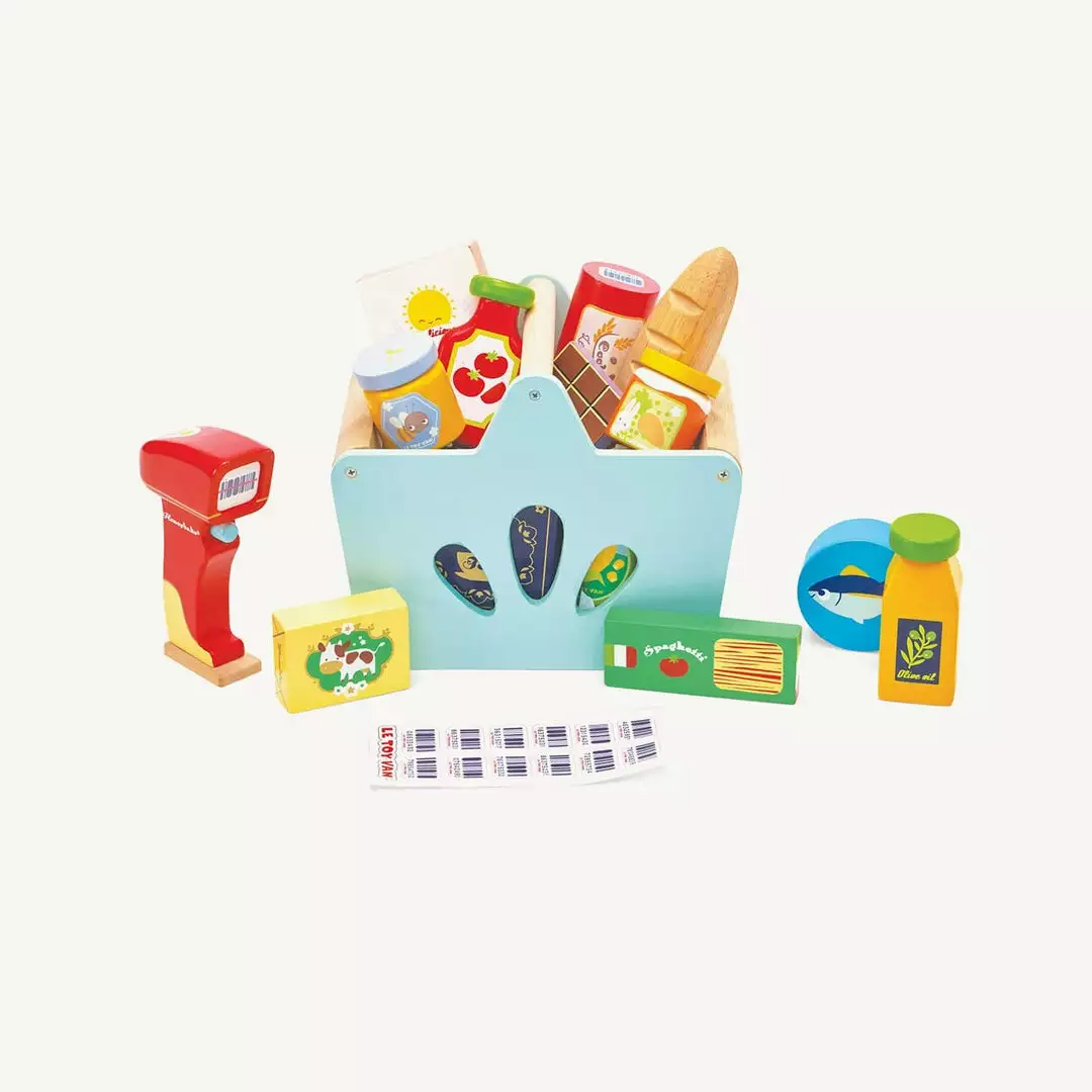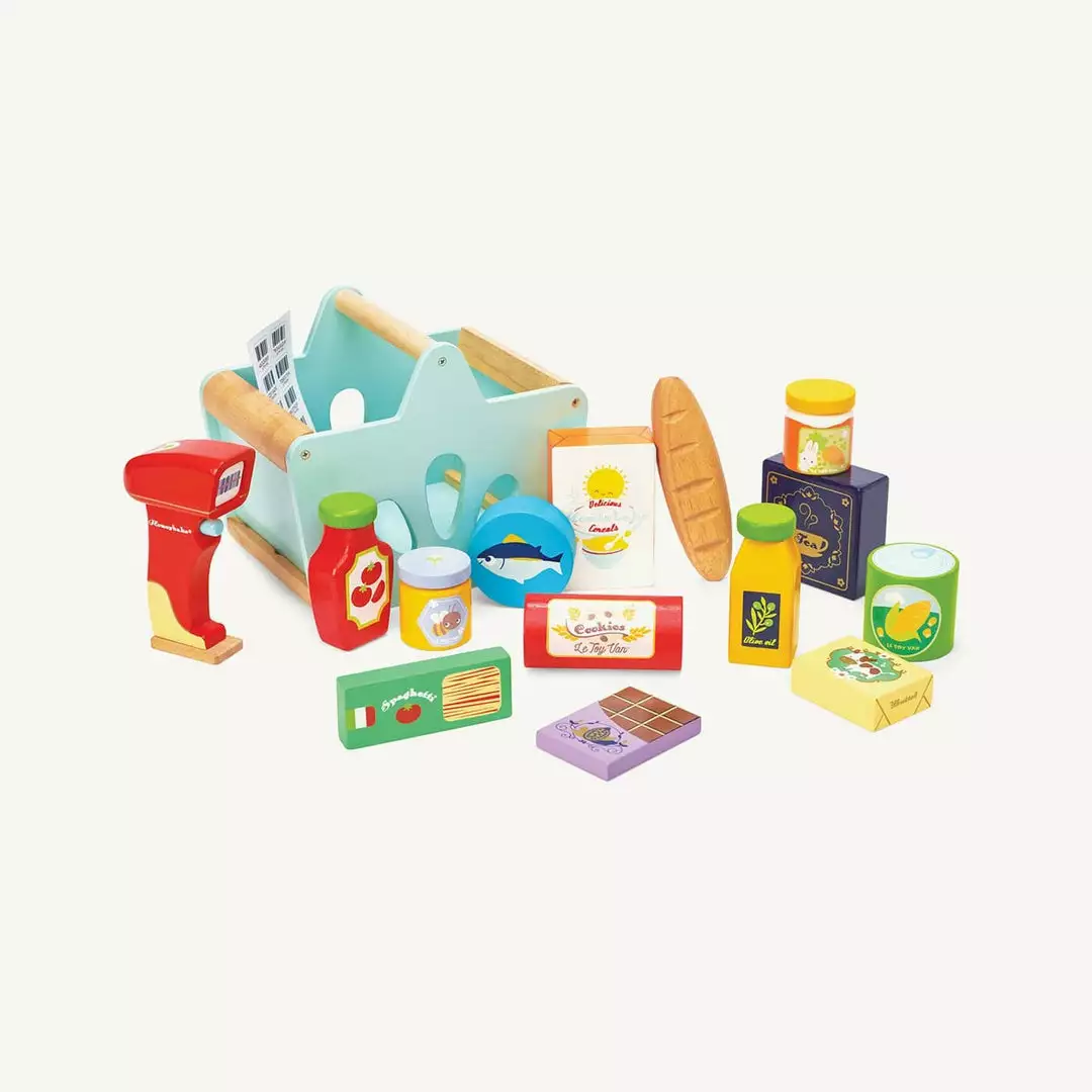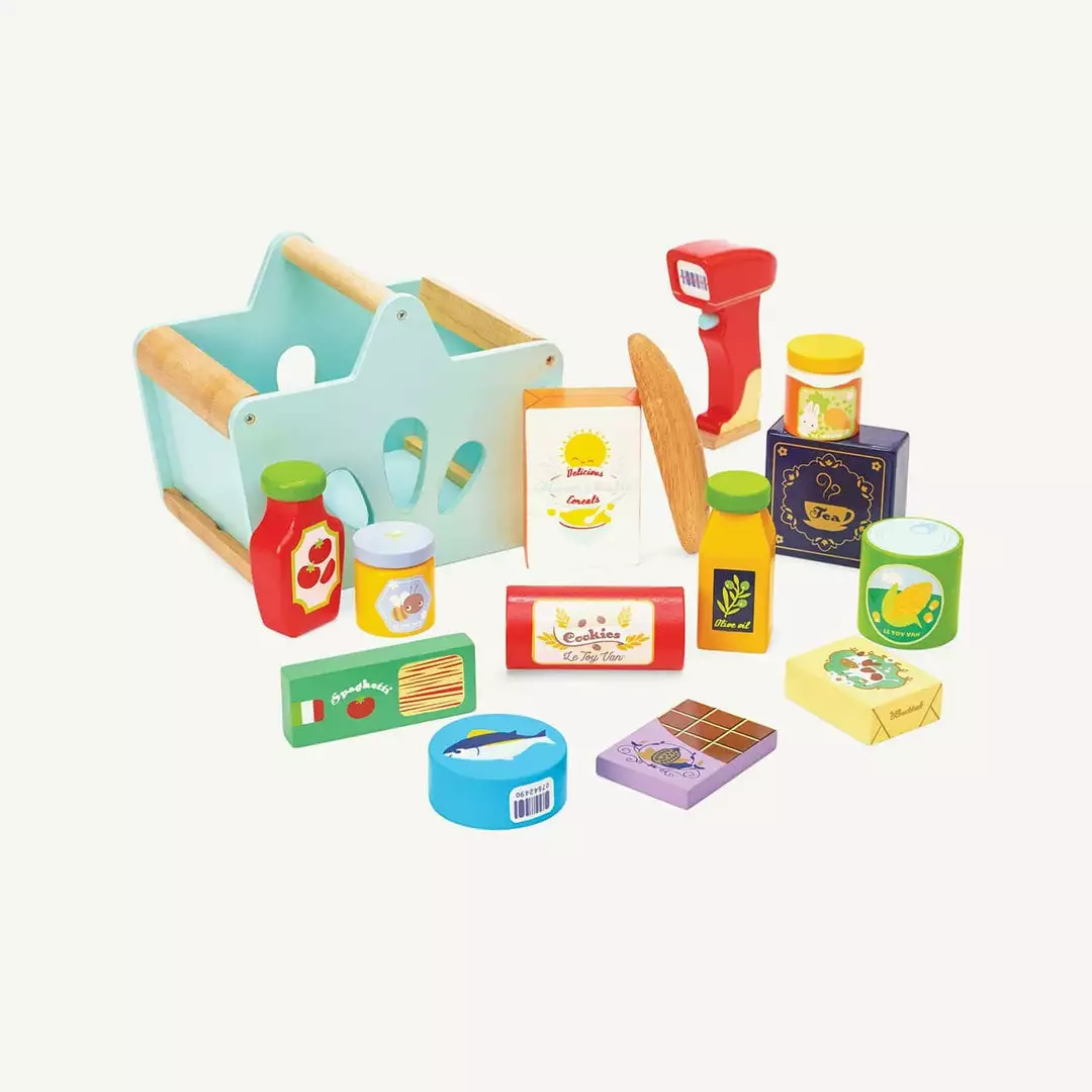 Honeybake Wooden Groceries Set & Scanner by Le Toy Van. This fantastic wooden groceries set comes packed with more than a dozen toy groceries and includes a wooden basket, a fun barcode scanner and some barcodes stickers. The brightly coloured illustrated grocery items include tuna can, butter, a baguette, cookies, sweet corn, ketchup, olive oil, spaghetti, chocolate and cereal. A lovely addition to the Le Toy Van Honeybake role play collection, this play set is great fun for imaginative role play and helps children developing their social, language and counting skills through play.