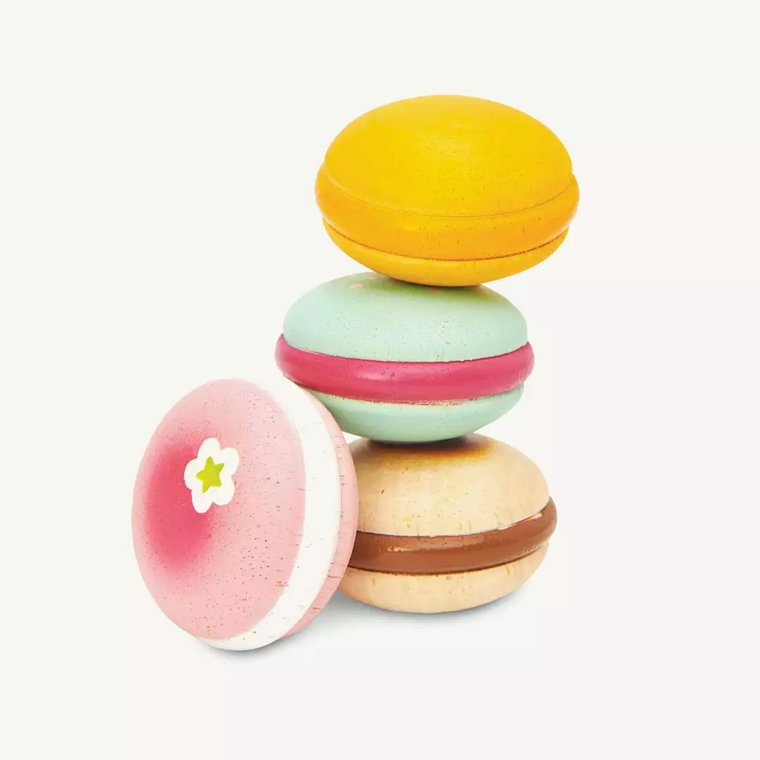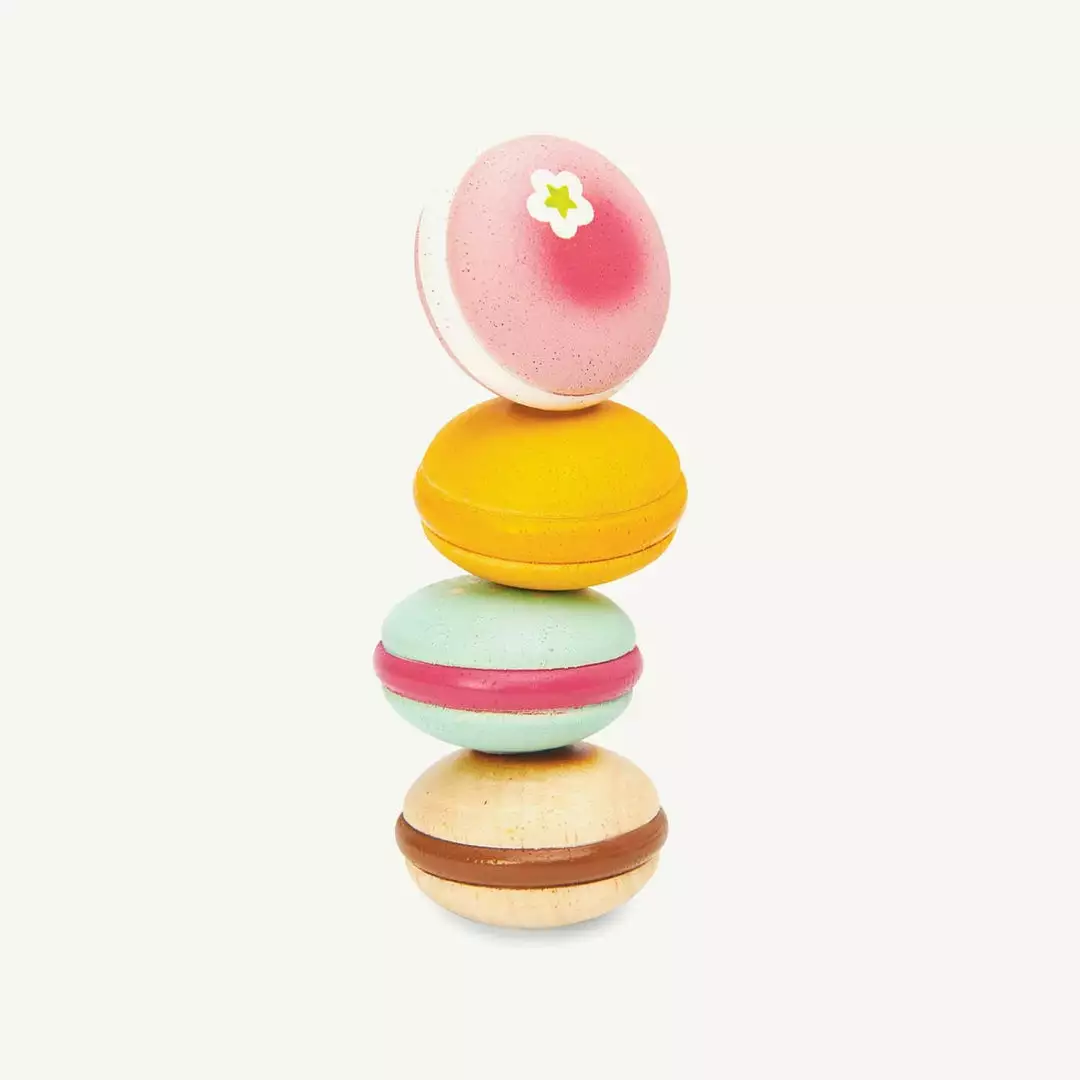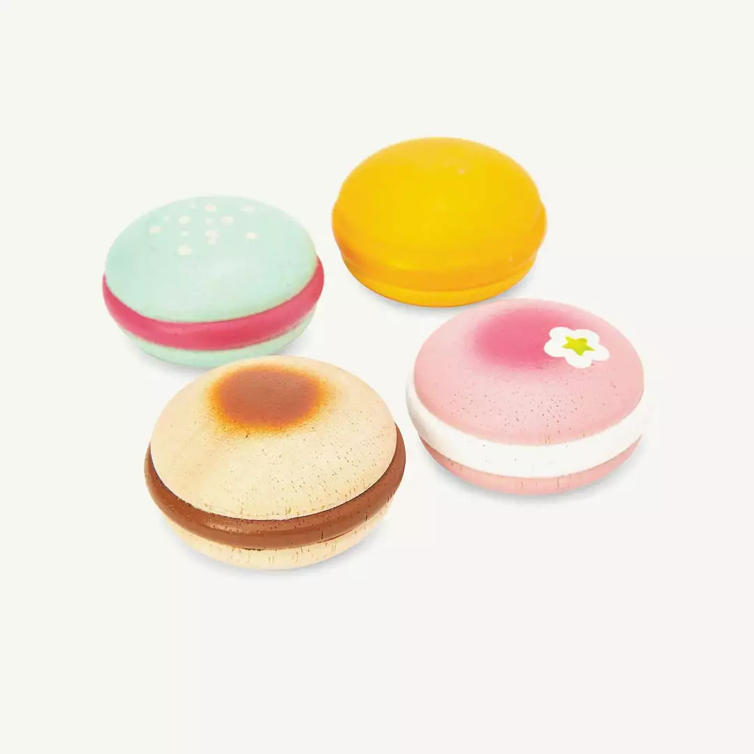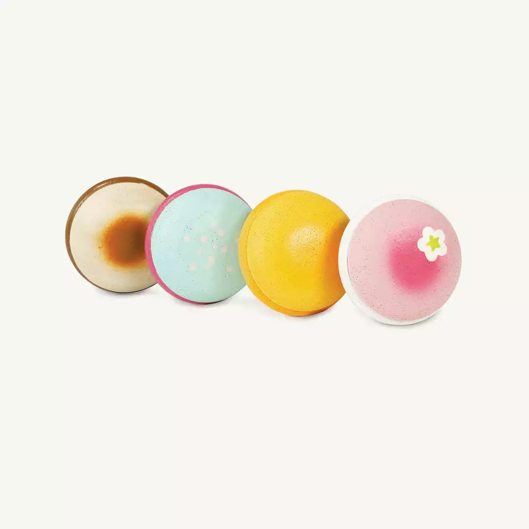 Honeybake Macarons by Le Toy Van. A lovely set of 4 solid wood macarons, each beautifully decorated in different colour ways using soft water based paints and presented in a sweet window gift box. These delicious treats look good enough to eat and are the ideal accessory for our Le Toy Van Honeybake Tea & Treats Trolley and other play sets from the Honeybake collection.Â