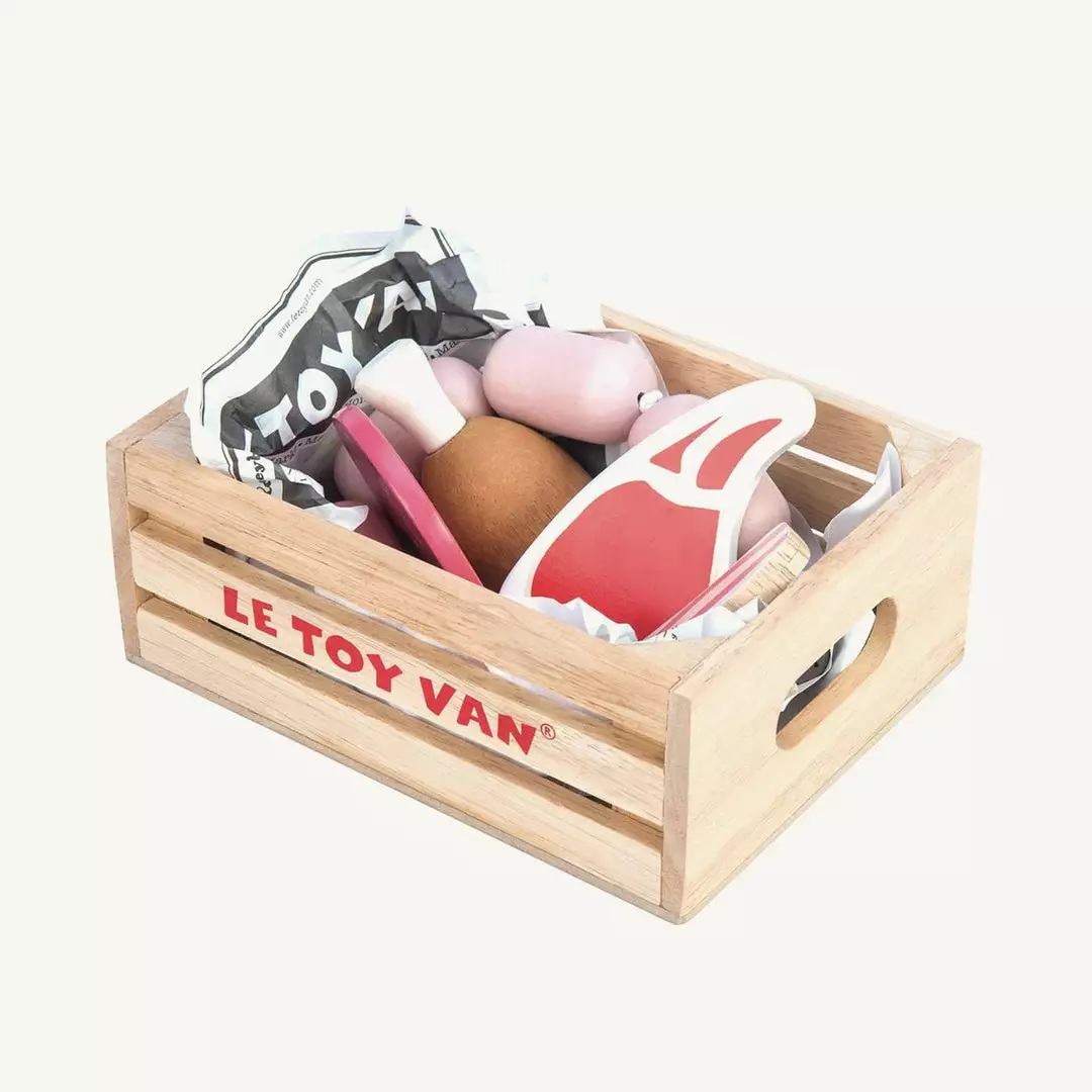 Honeybee Market Meat Crate Le Toy Van. A crate of wooden meat, perfect for budding little butchers or greengrocers and a great addition to our Honeybee Market Stall and other grocery crates. The set includes sausage, steak, chicken, salami & bacon pieces.