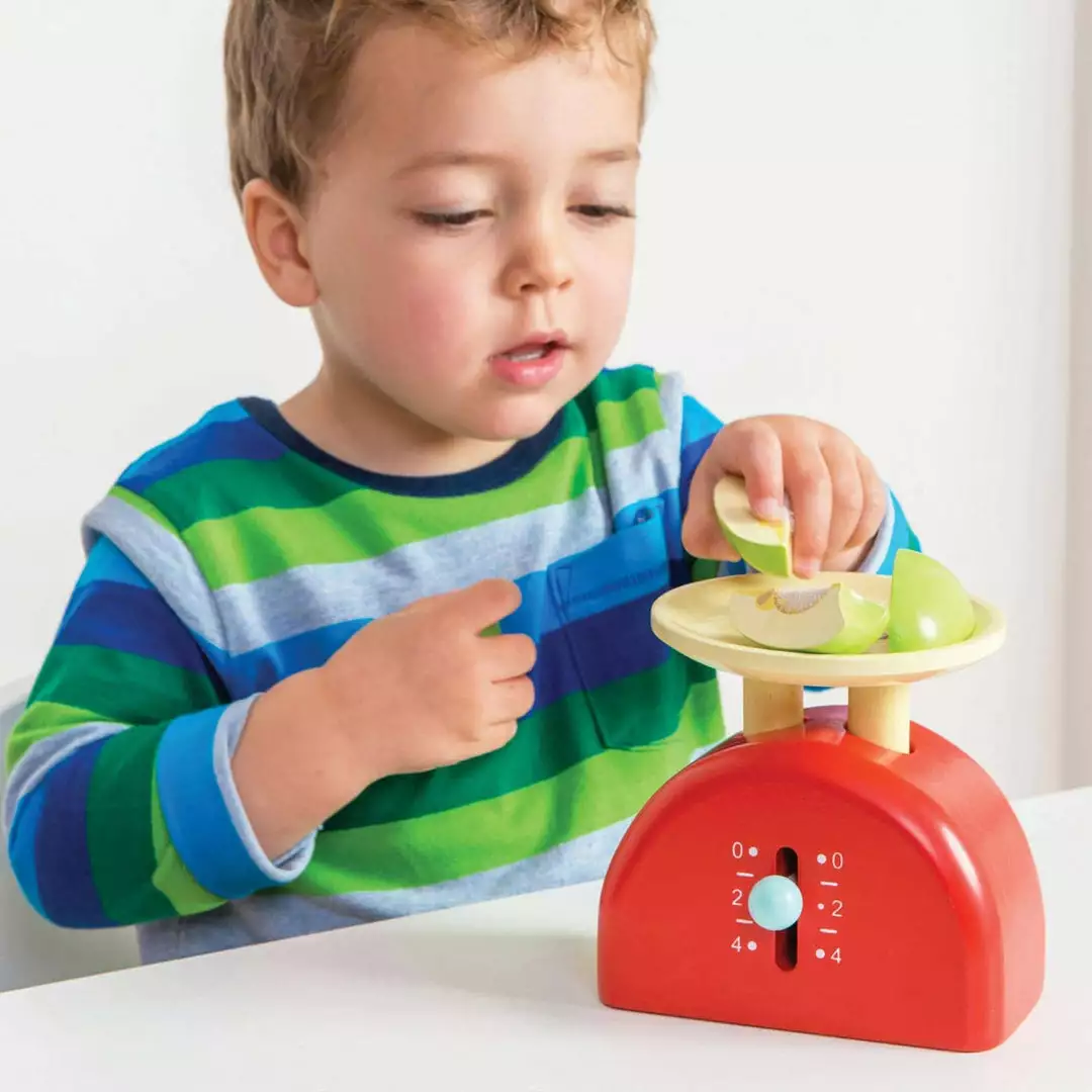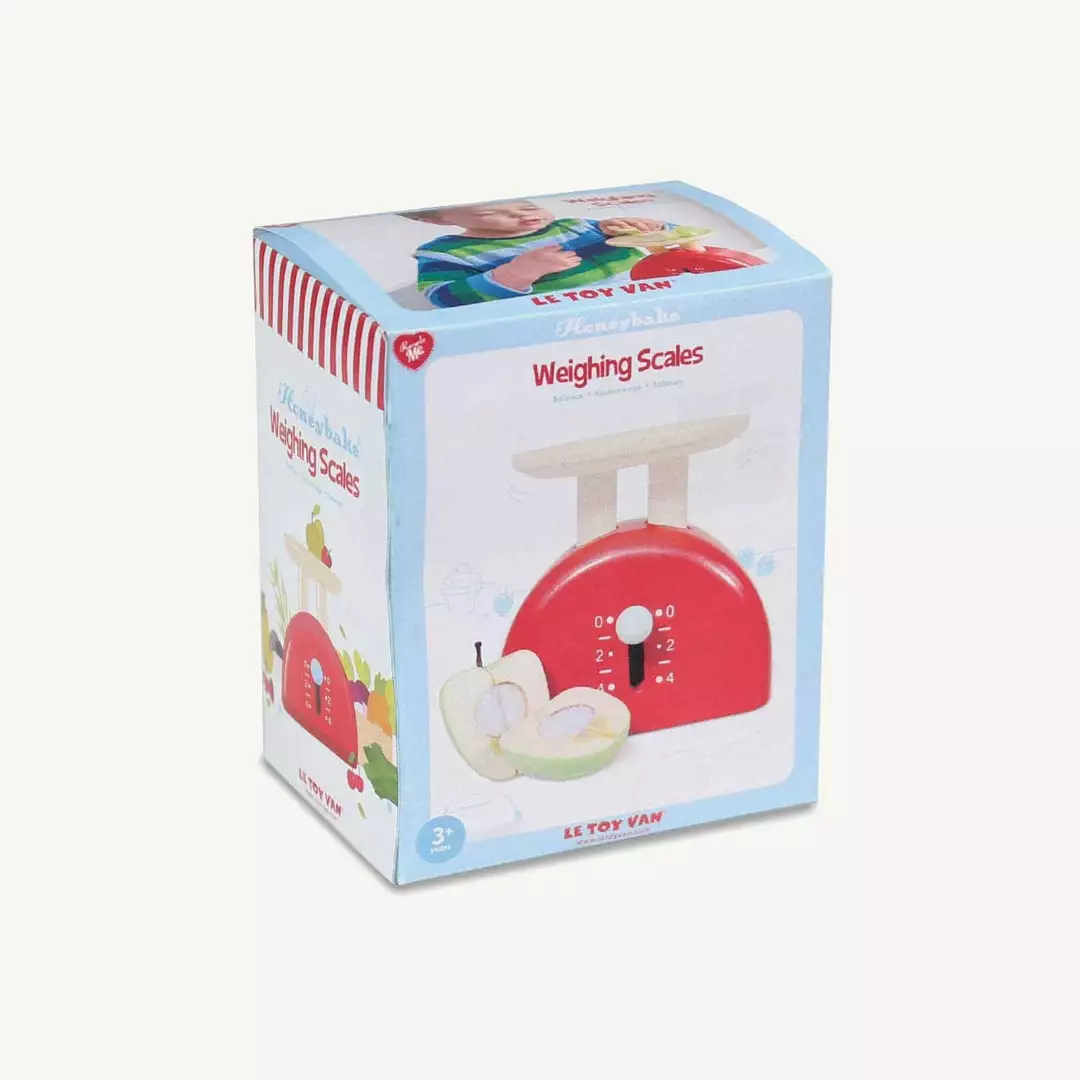 Wooden Weighing Scale Set by Le Toy Van. This bold and fun wooden weighing scale is a perfect accompaniment to the ever-popular Honeybake range. Painted bright red, and featuring a moving gauge, it comes with a wooden apple that can be quartered (held together by velcro).Â