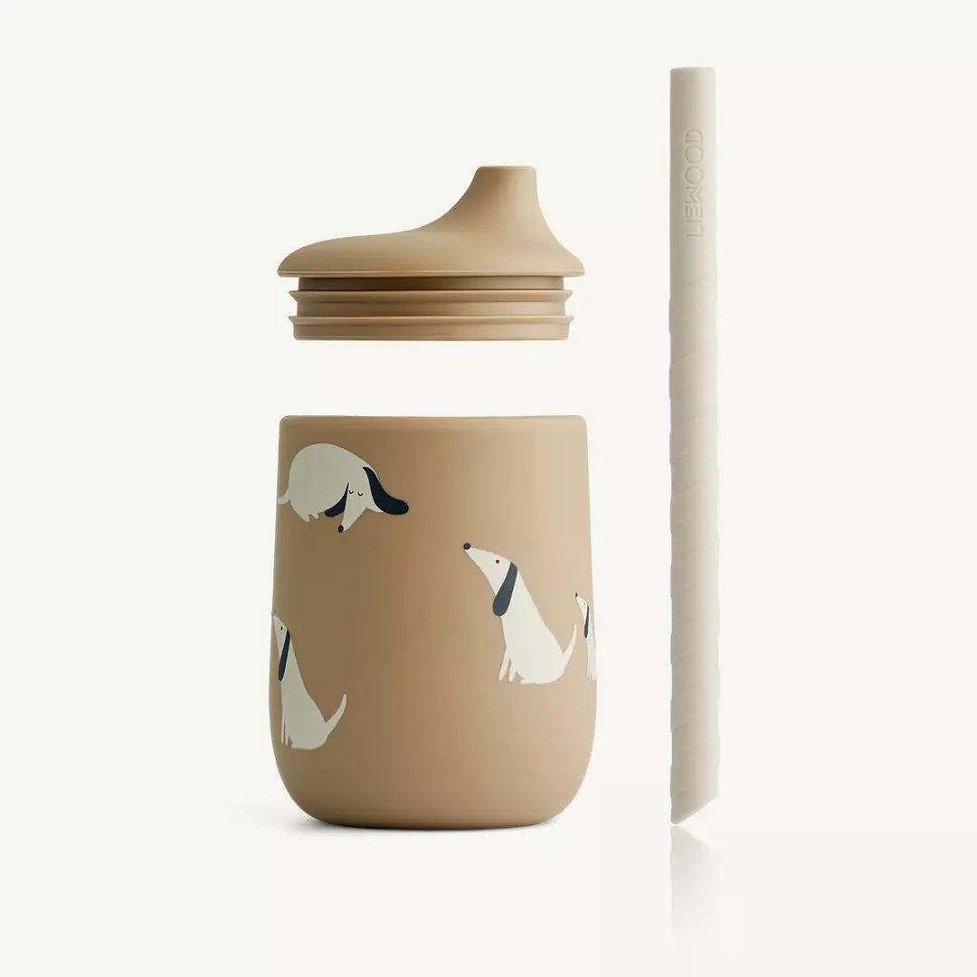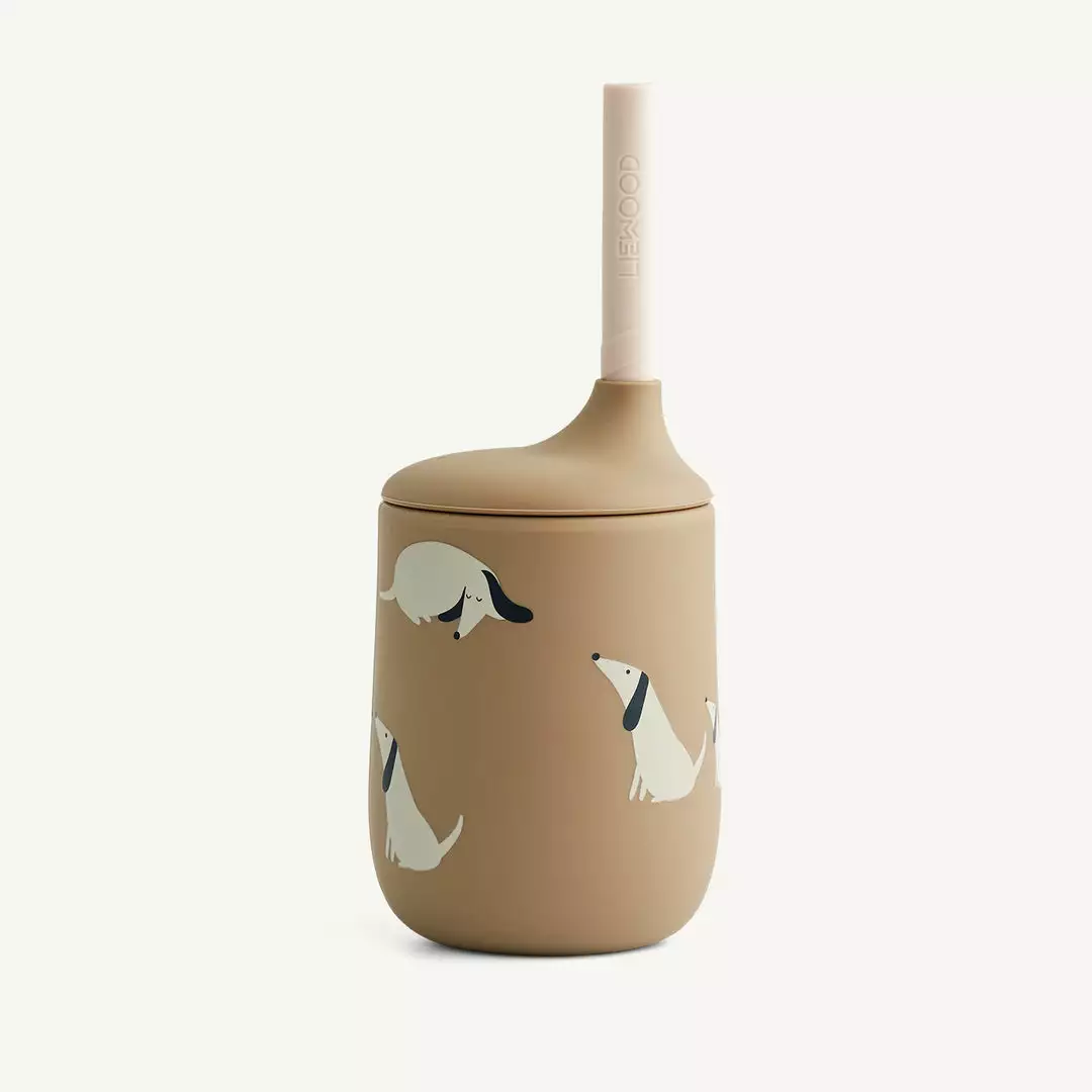 Ellis Sippy Cup Dog / Oat Mix by Liewood. The Ellis Sippy Cup is made from 100% silicone and a great way for your child to improve the fine motor skills. The removable lid has a small spout and can be used with or without the accompanying straw.