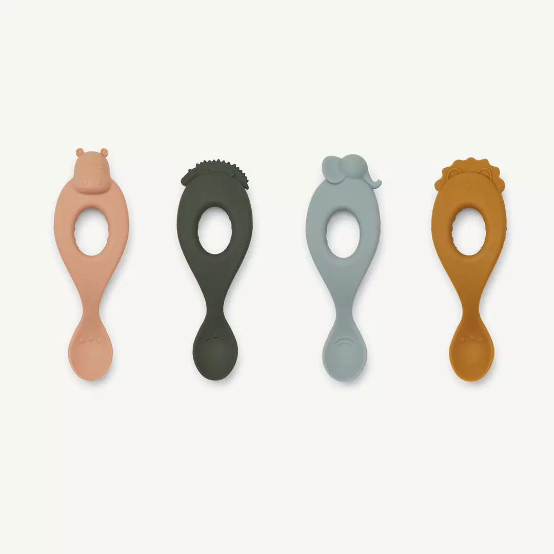 Liva Silicone Spoon 4-pack – Safari / Rose Multi Mix by Liewood. The Liva Silicone Spoon is perfect for when your baby begins to eat porridge etc. The small marks on the spoon itself provide the baby a sense of how far the spoon will enter the mouth. Available in many different colours with the cute Liewood animals on top.