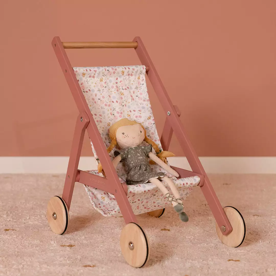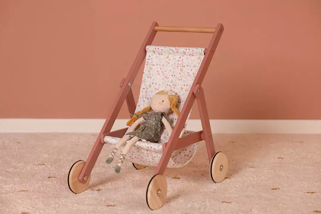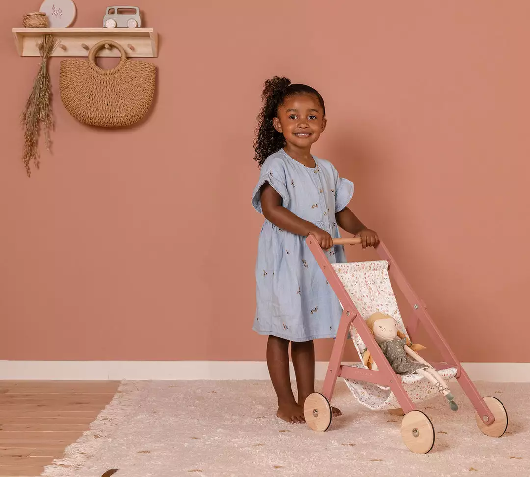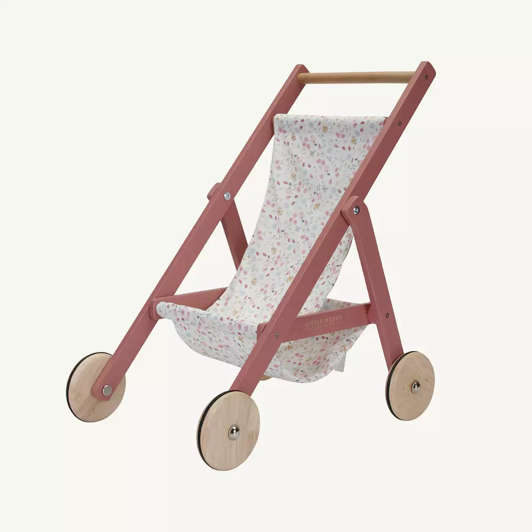 Dolls Stroller Flowers & Butterflies by Little Dutch. This gorgeous wooden dolls strollers with Spring Flower Print is one of the prettiest strollers we have ever seen and a lovely addition to any play room. A strong, sturdy stroller with a beautifully finished wooden frame, it features wooden wheels with a rubber trim for extra protection and a smooth ride. Extra storage can also found under the seat so your little one can pack everything they need to take care of their dolls and soft toys.Â