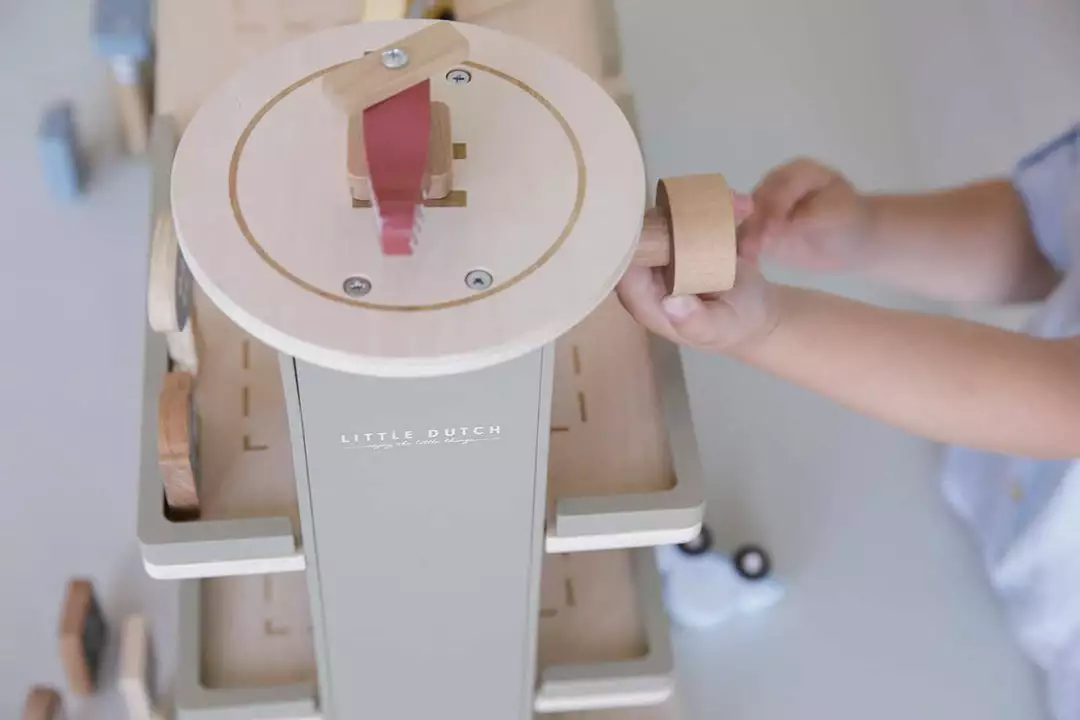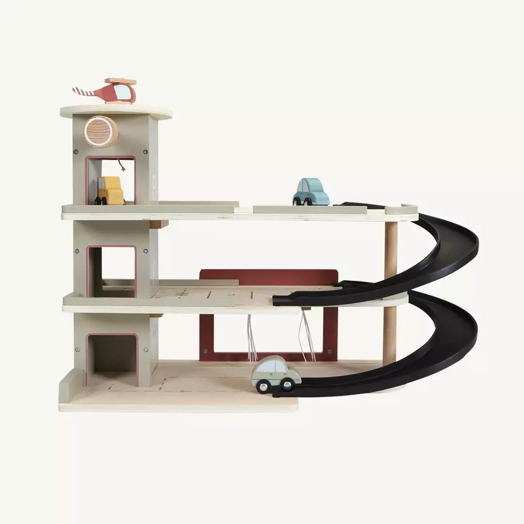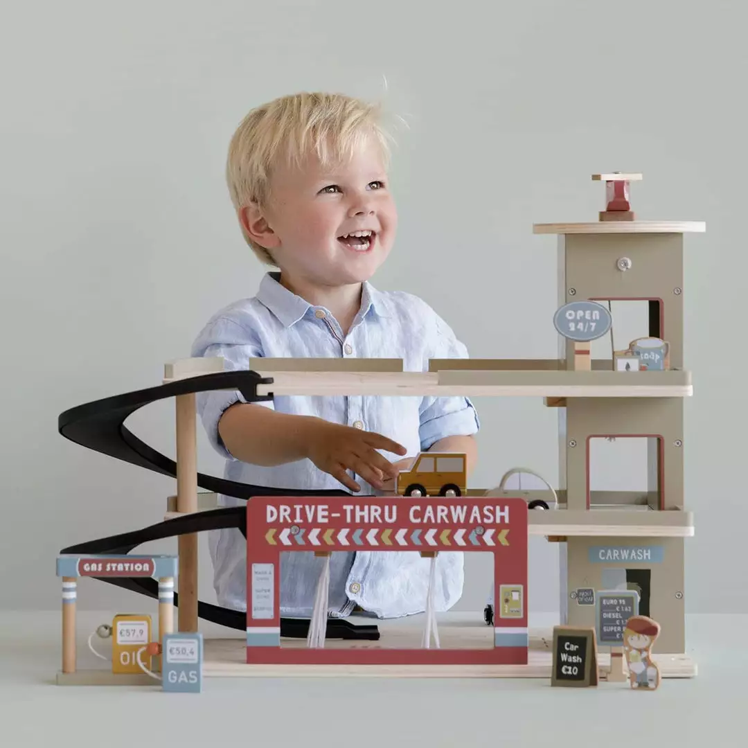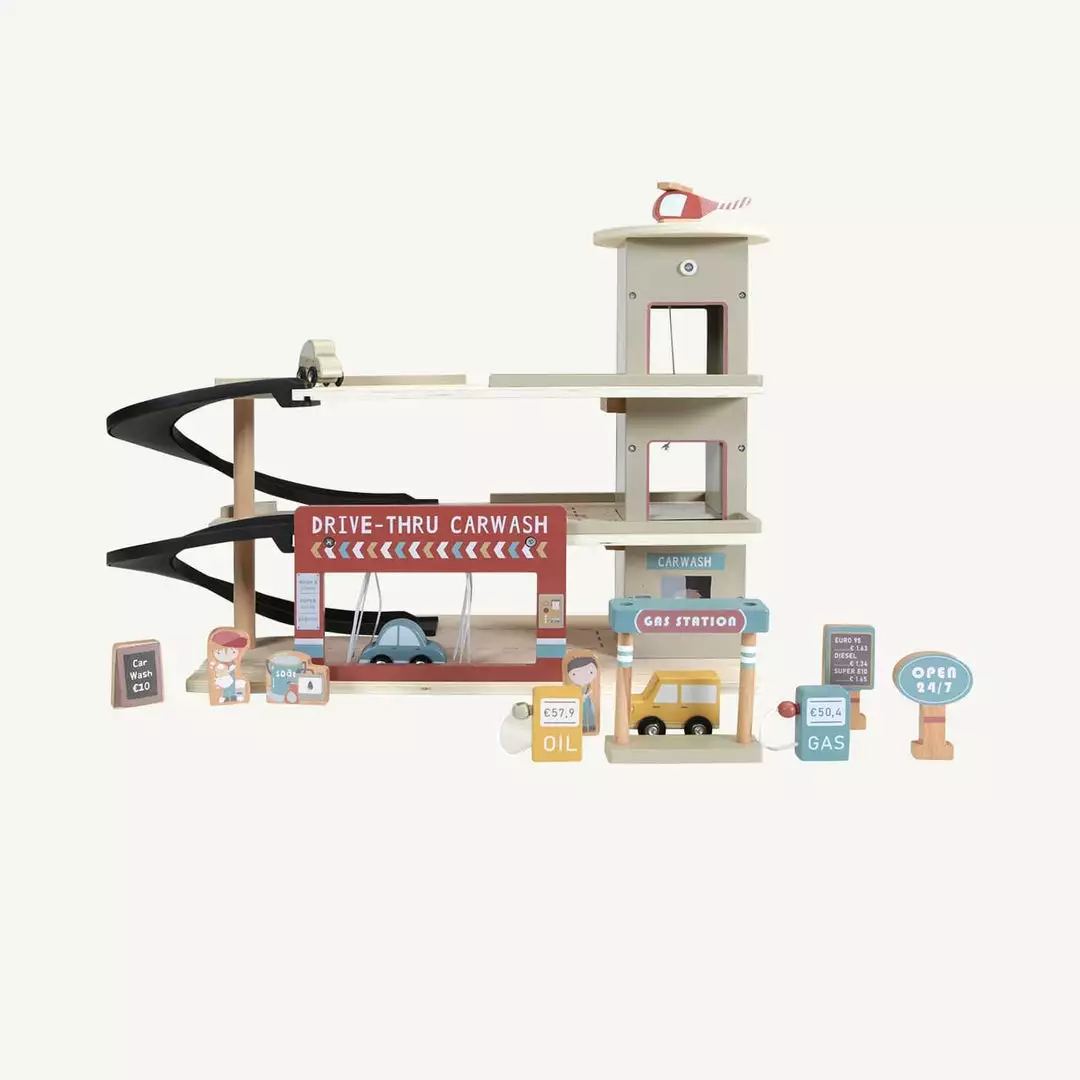 Railway Extension Garage by Little Dutch. Stop by the garage to fill up on gas, park your car or get it cleaned in the carwash. Made from durable FSC certified wood, this sturdy wooden Garage is perfect for hours of fun play. The Garage includes a helicopter platform and car wash, and the wooden figurines and elements all have detailed illustrations on both sides.Â