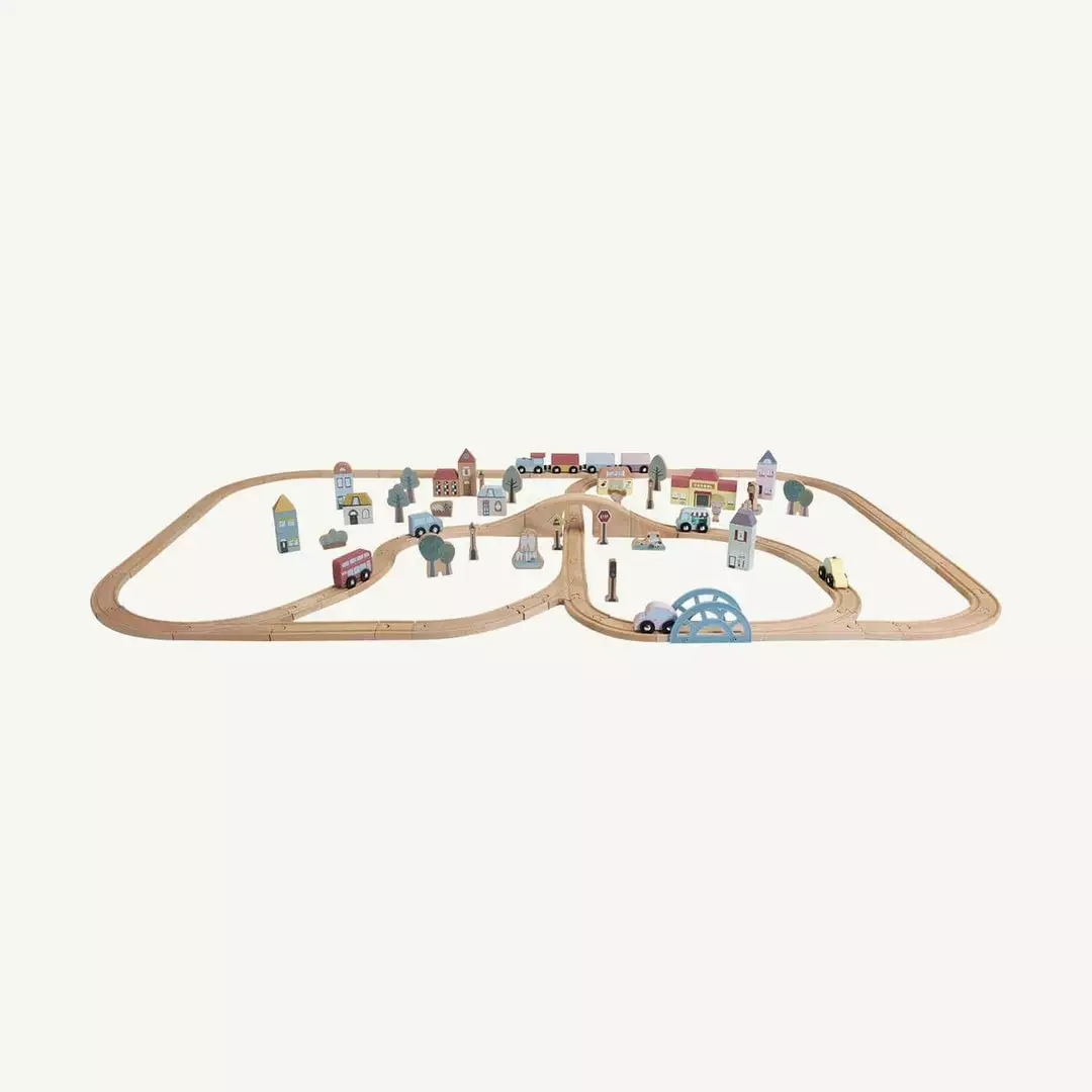 Railway Train XXL Set by Little Dutch. Go on endless adventures with the Little Dutch wooden railway track. Hop on board the train, the bus, the taxi or the car and explore the town. With more than 100 parts, this set offers many options to get creative and build new combinations over and over again. Each of the wooden figurines and elements has detailed illustrations on both sides. Perfect for pairing with the Little Dutch Railway Extension Garage.