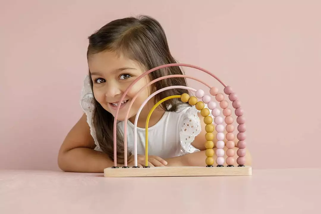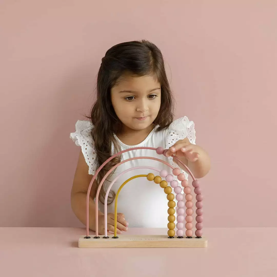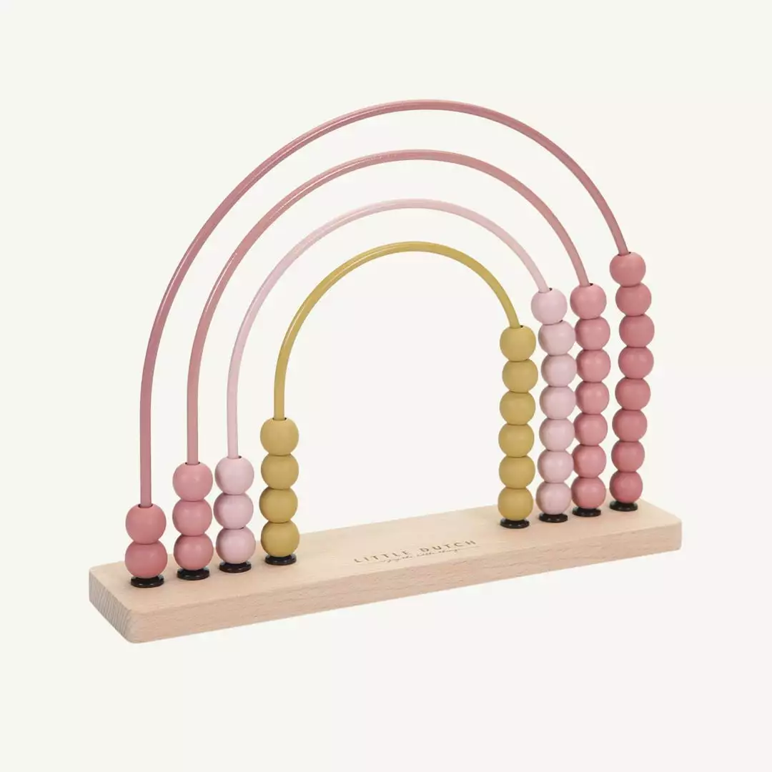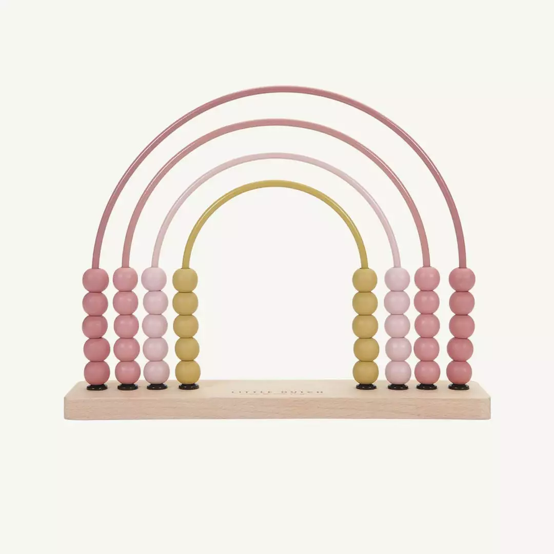 Wooden Rainbow Abacus in Pink by Little Dutch. A classic toy, given a modern twist, this gorgeous Rainbow Abacus is a lovely addition to any playroom or living room. The rainbow is made of coloured metal arches on a wooden base with 10 wooden beads on each arch. This is a lovely educational toy that makes learning maths fun and helps your child develop skills in recognising patterns and colours, while honing fine motor skills.Â