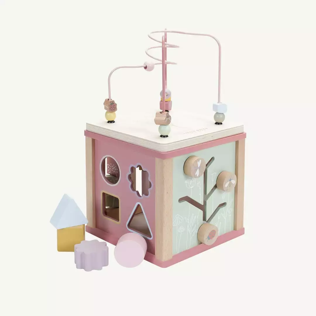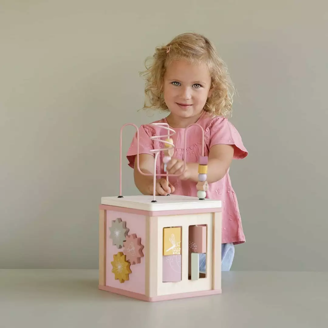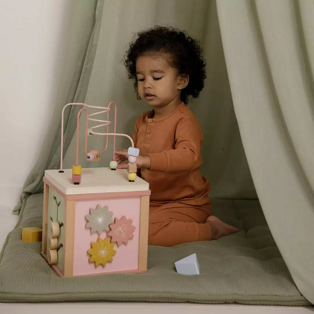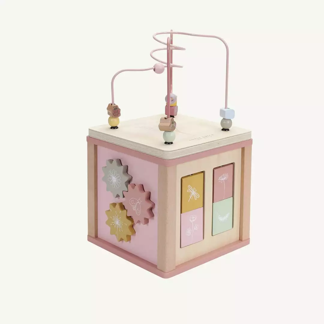 Wooden Activity Cube Wild Flowers by Little Dutch. This wooden activity cube provides plenty of challenges for children. Each side features wonderful Wild Flowers illustrations and offers a different educational activity, including a shape sorter, turning gears, puzzles and a fun bead spiral on top. With each activity, children develop their fine motor skills and are encouraged to use their creativity. This toy captivates children’s curiosity and brings lots of fun.
