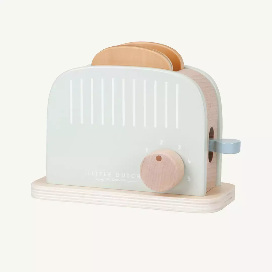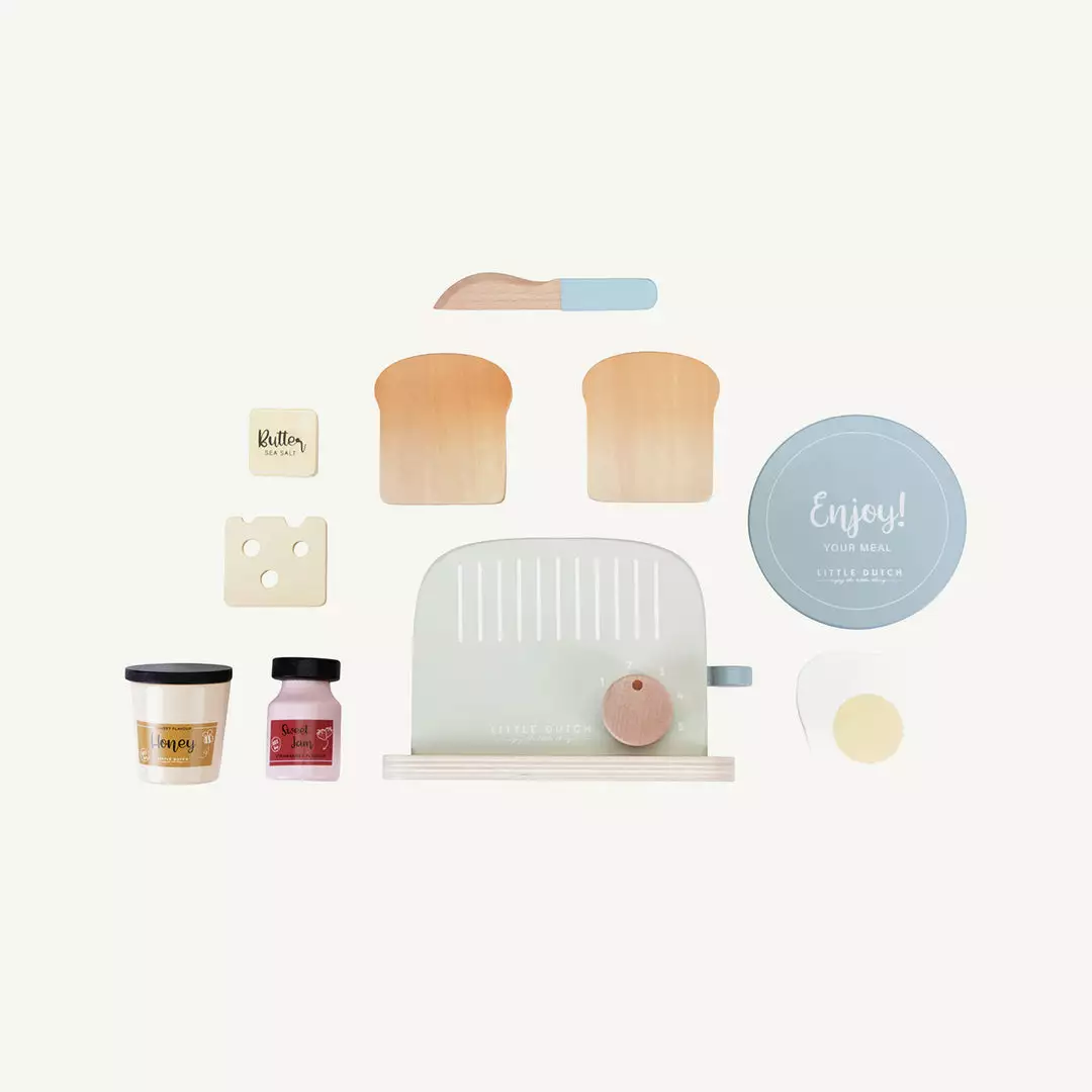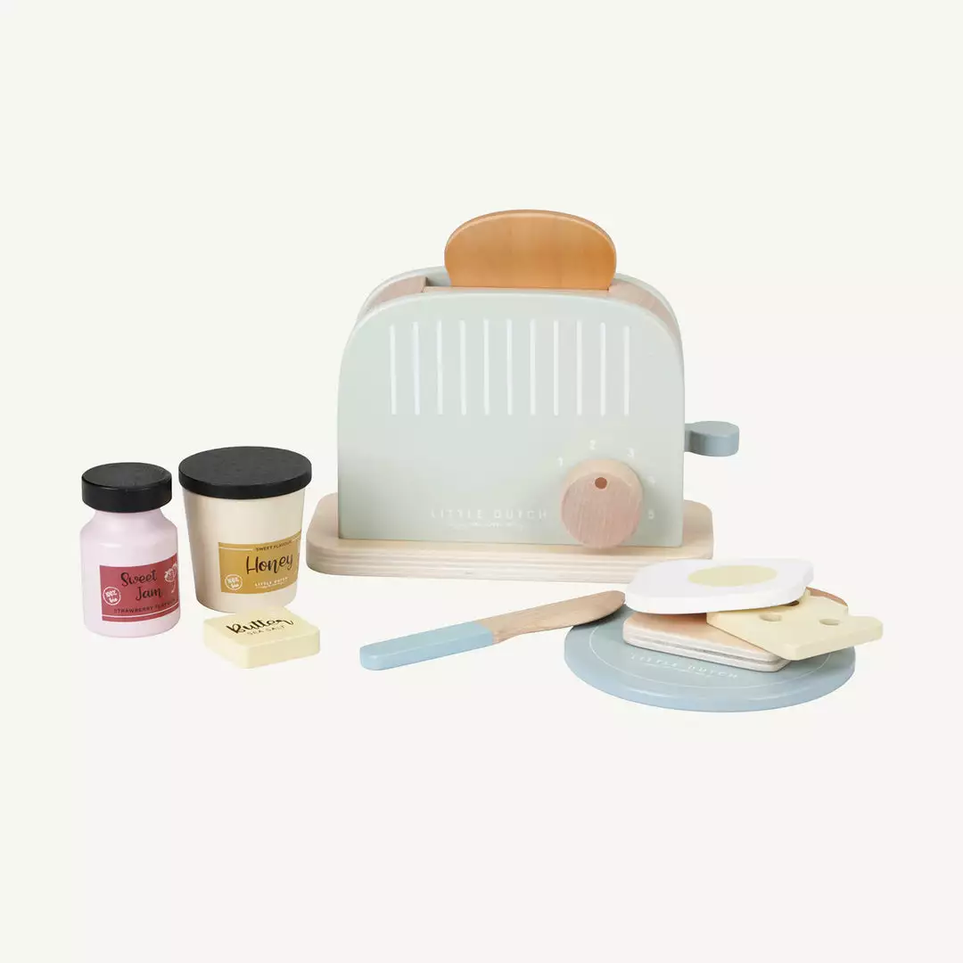 Wooden Toy Toaster Set by Little Dutch. Your little ones will love making a delicious breakfast with this lovely wooden toy toaster set. Prepare the slices of bread in the toaster by pushing down the lever. When the slices pop up, they are ready to serve. Add some butter, cheese, marmalade or a fried egg to complete the breakfast party. This set also comes with a wooden plate and knife. Children love to mimic their parents’ everyday rituals such as preparing breakfast. This toaster set is great for pretend play and combines nicely with our Little Dutch wooden Coffee Machine, and other kitchen and cafe toys from our fabulous range of Pretend Play Toys.
