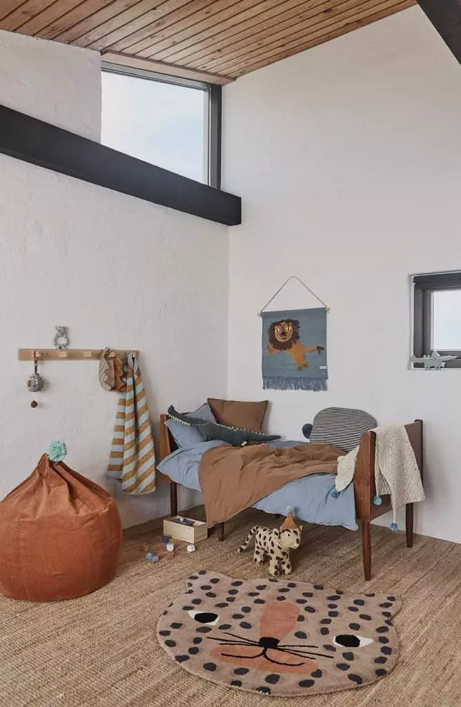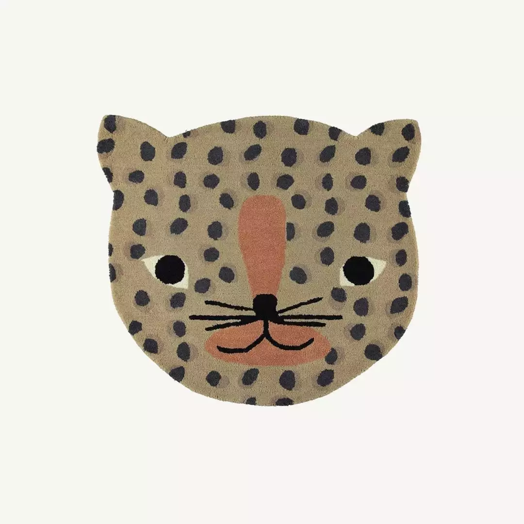Leopard Rug by OIOI. This beautiful Leopard rug will add warmth and fun to your child’s play room or bedroom. Little ones love the eye catching playful design and friendly Leopard face which really brings a room to life. Whether sitting or laying down, these super soft rugs provide a comfy place to play and rest.Â