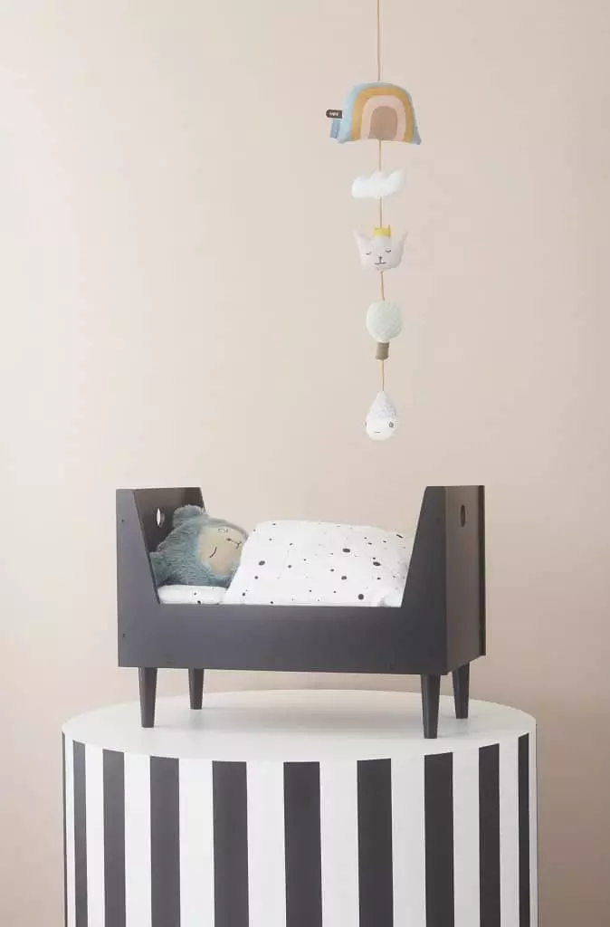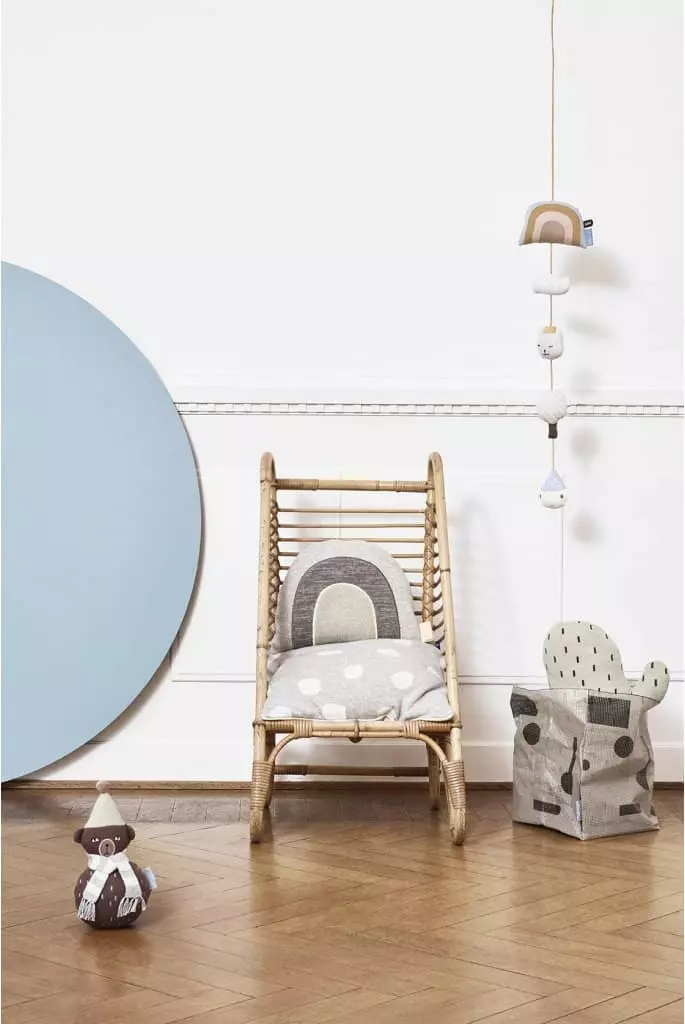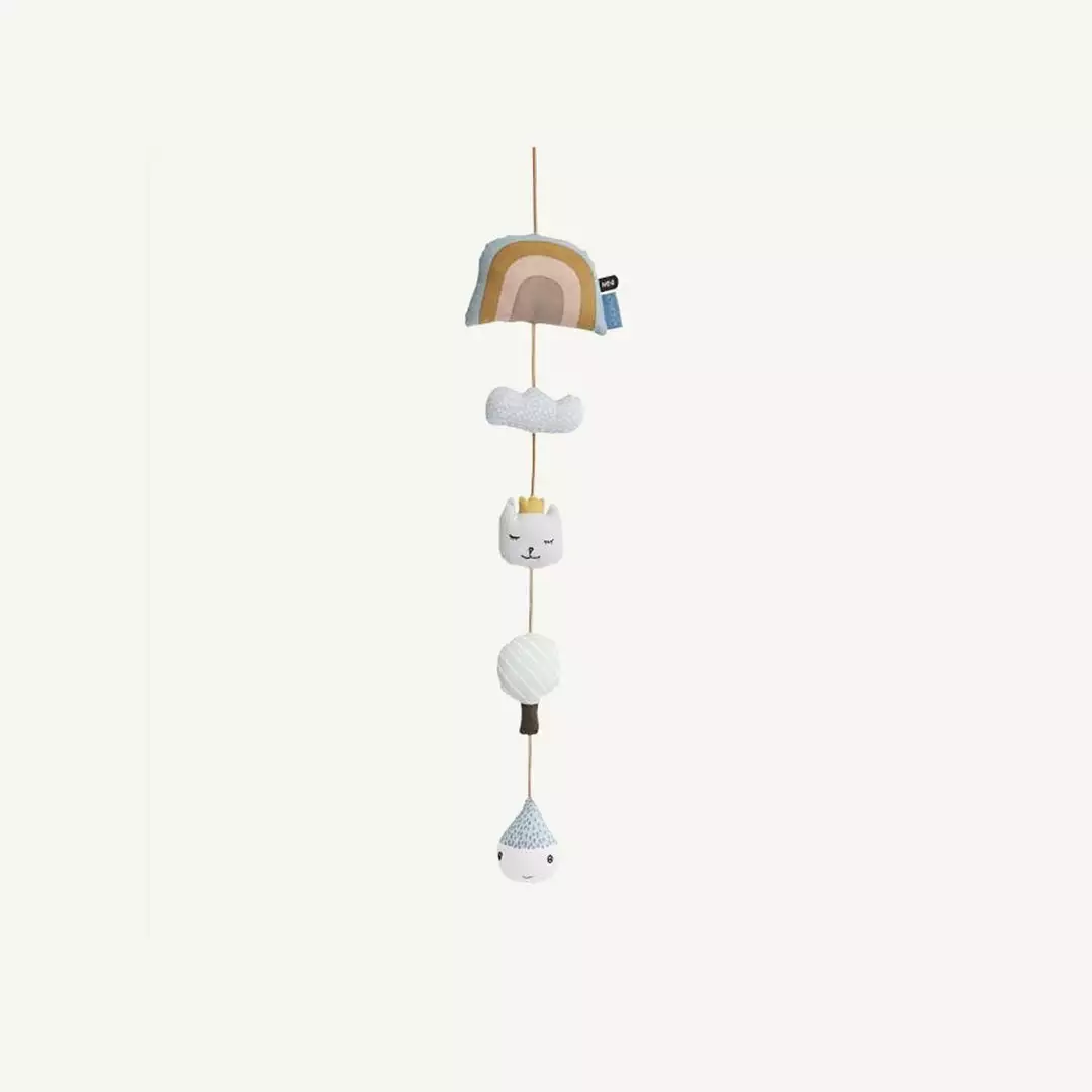 Rainbow Mobile by OYOY. The OYOY Rainbow Baby Mobile is an adorable accessory for your child’s nursery and babies love waking up to the cute little characters and shapes. The mobile can be hung above a cot or changing station and is perfect for keeping babies entertained during nappy changes as well as developing their senses. The Rainbow Mobile is made of 100% organic cotton and has a leather string for hanging purposes.