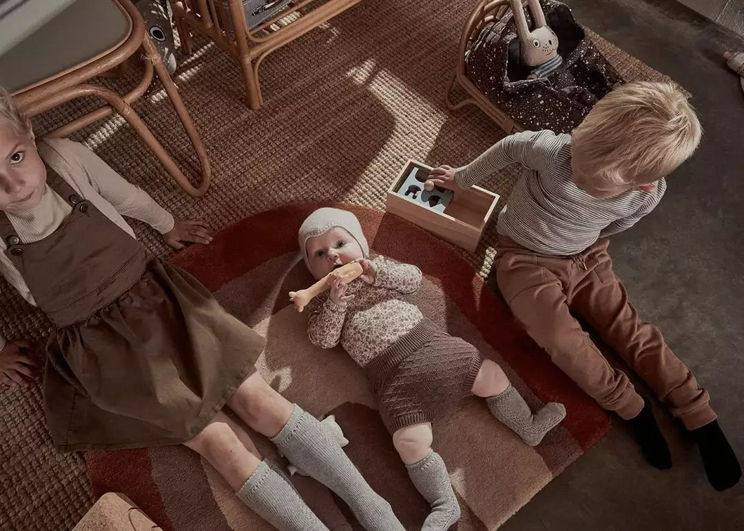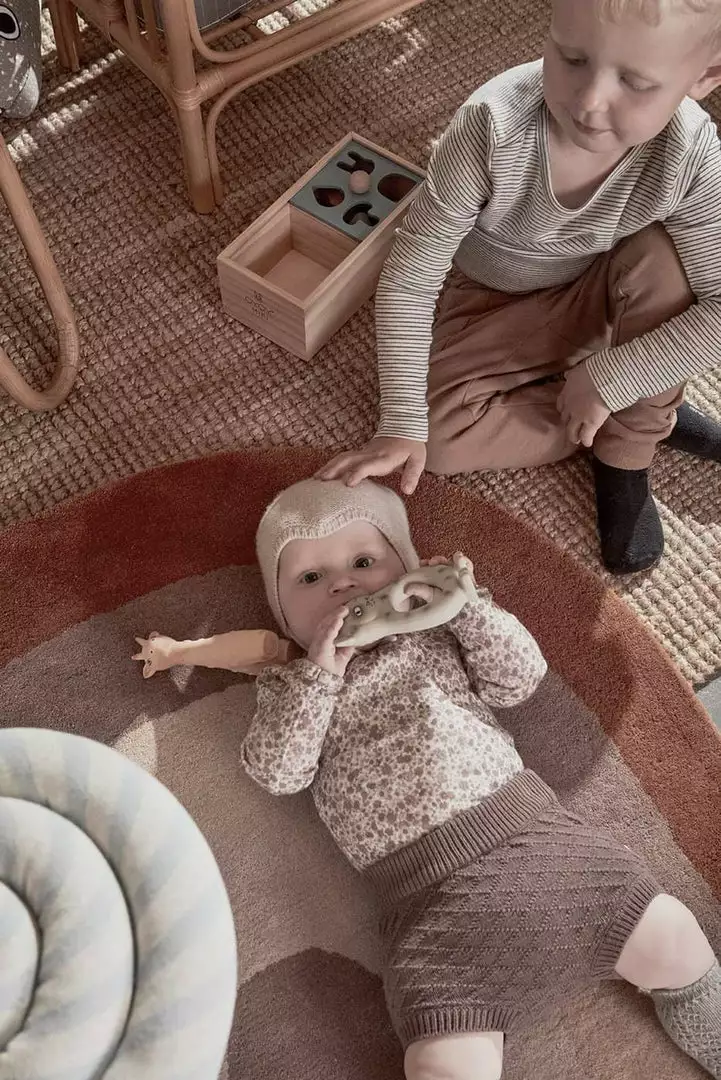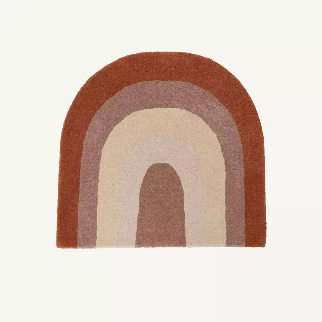 Rainbow Rug in Choko by OIOI. This beautiful rainbow design rug is a stunning addition to any kids room or living room. The soft muted colours blend beautifully in the home, giving it a lovely warm feeling, perfect for rainbow themed rooms and mixing other rainbow accessories! Whether sitting or laying down, these super soft rugs provide a comfy place to play and rest. Match with OYOY’s ‘Follow the Rainbow’ wall rug in Choko to create your dream rainbow themed room.
