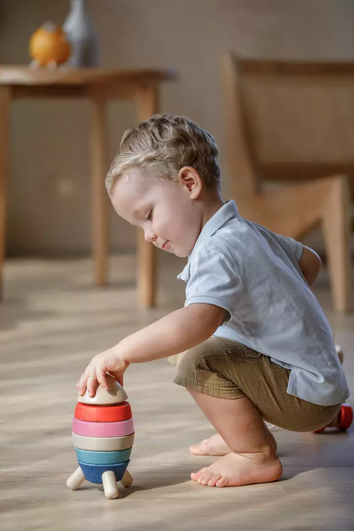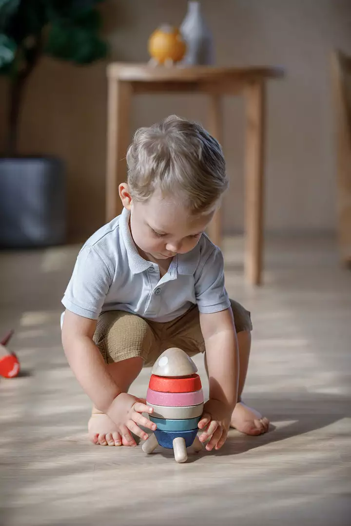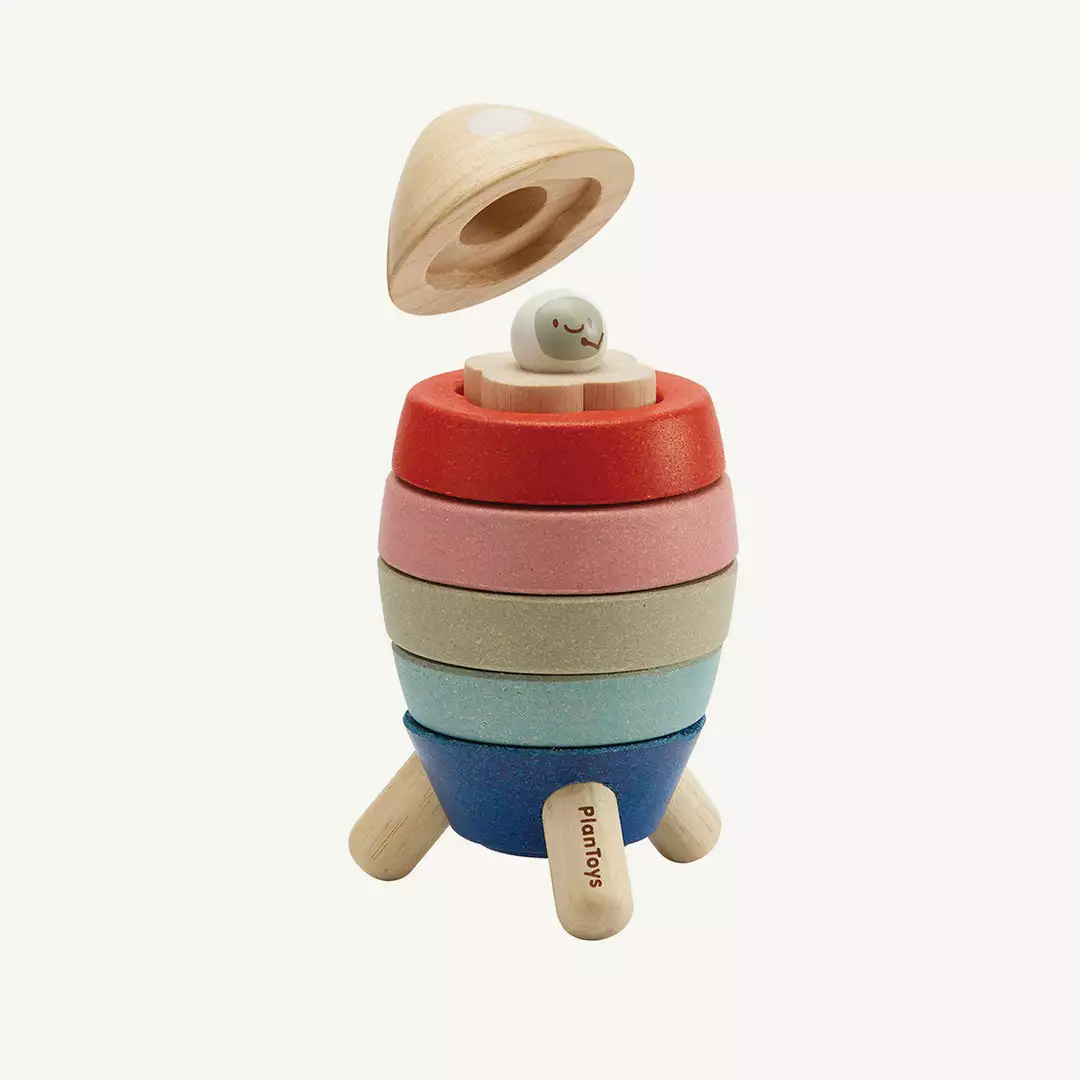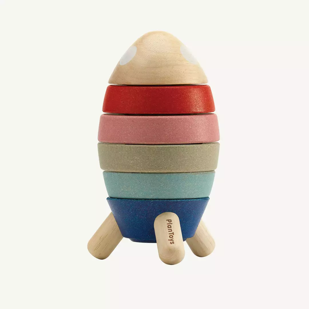 Plan Toys Stacking Rocket. This stylish and colourful take on a classic stacking toy is a fun way to help your little one learn about shapes and colours, along with developing their hand-eye co-ordination and motor skills. A wonderful toy for little imaginations, they will love stacking the colourful pieces and jetting off on a space adventure.Â