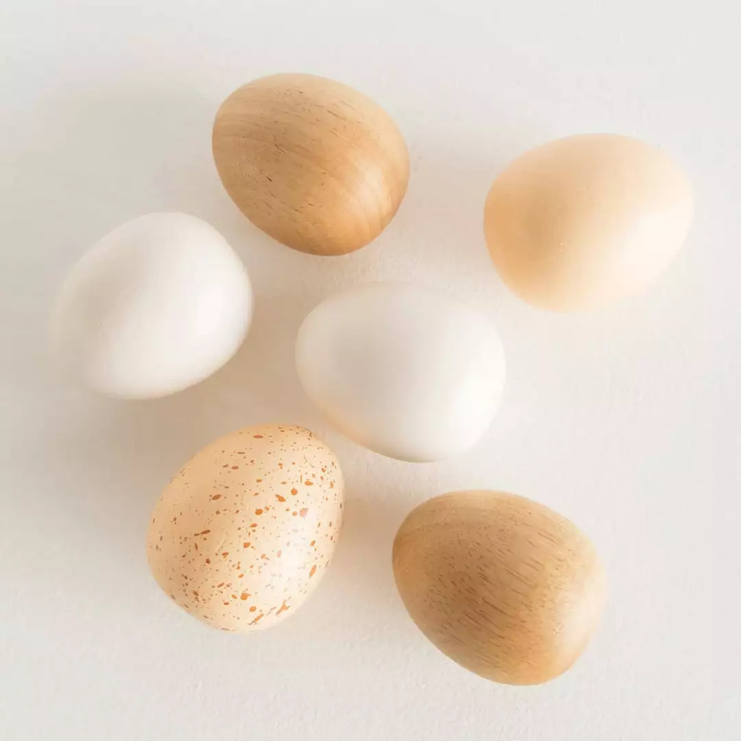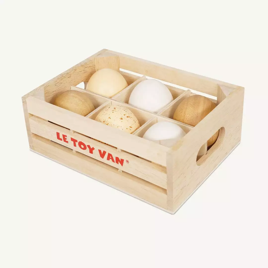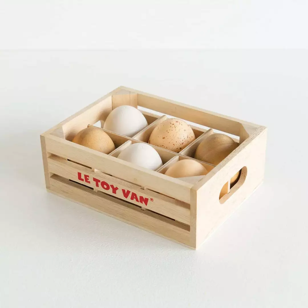 Honeybee Market Farm Eggs Half Dozen Crate by Le Toy Van. Solid and sustainable Rubberwood eggs, a shopping essential that won’t crack open! The set includes a wooden crate and 6 solid wood eggs; perfect for budding little greengrocers and a great addition to our Honeybee Market Stall and other grocery crates.Â