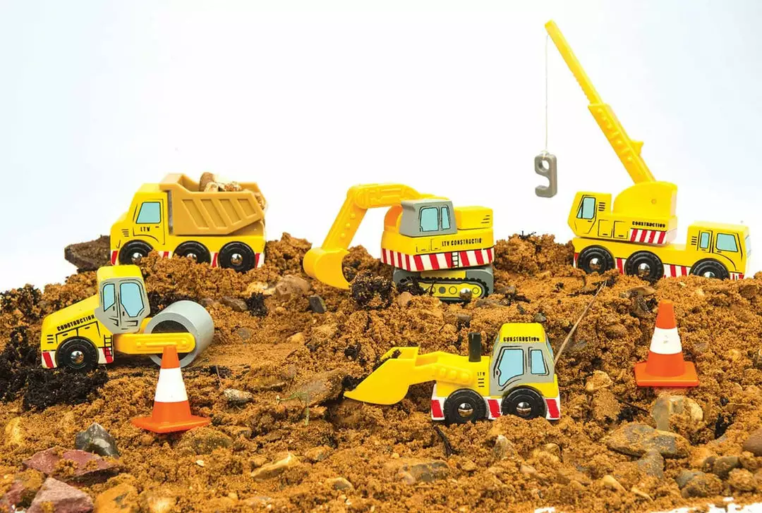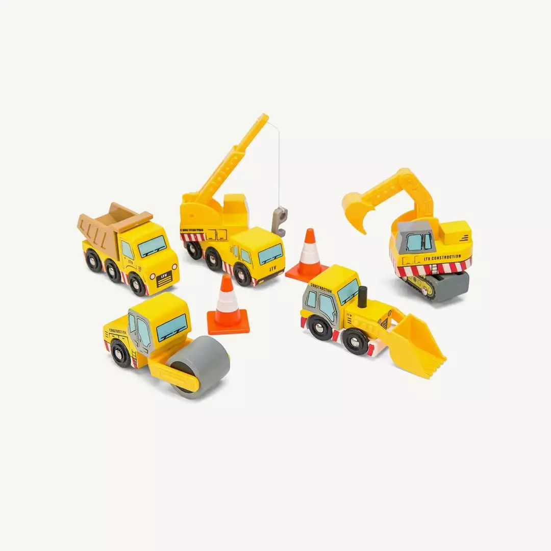 Wooden Construction Set by Le Toy Van. Build it up! A set of 5 construction vehicles with functioning parts – lifting crane, scoop, roller, digger and tip-up truck and two traffic cones. All vehicles have functional parts, including an extendable crane and an articulated digger arm. Each vehicle is perfectly scaled for Le Toy Van garage and vehicle sets, including our ‘Big Wooden Crane’.