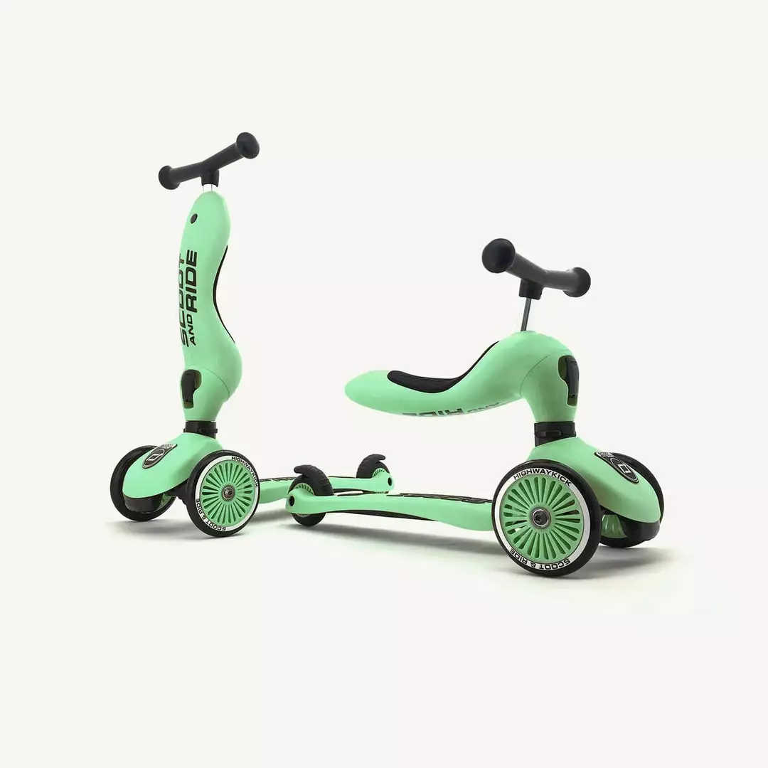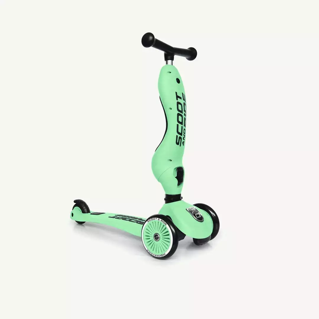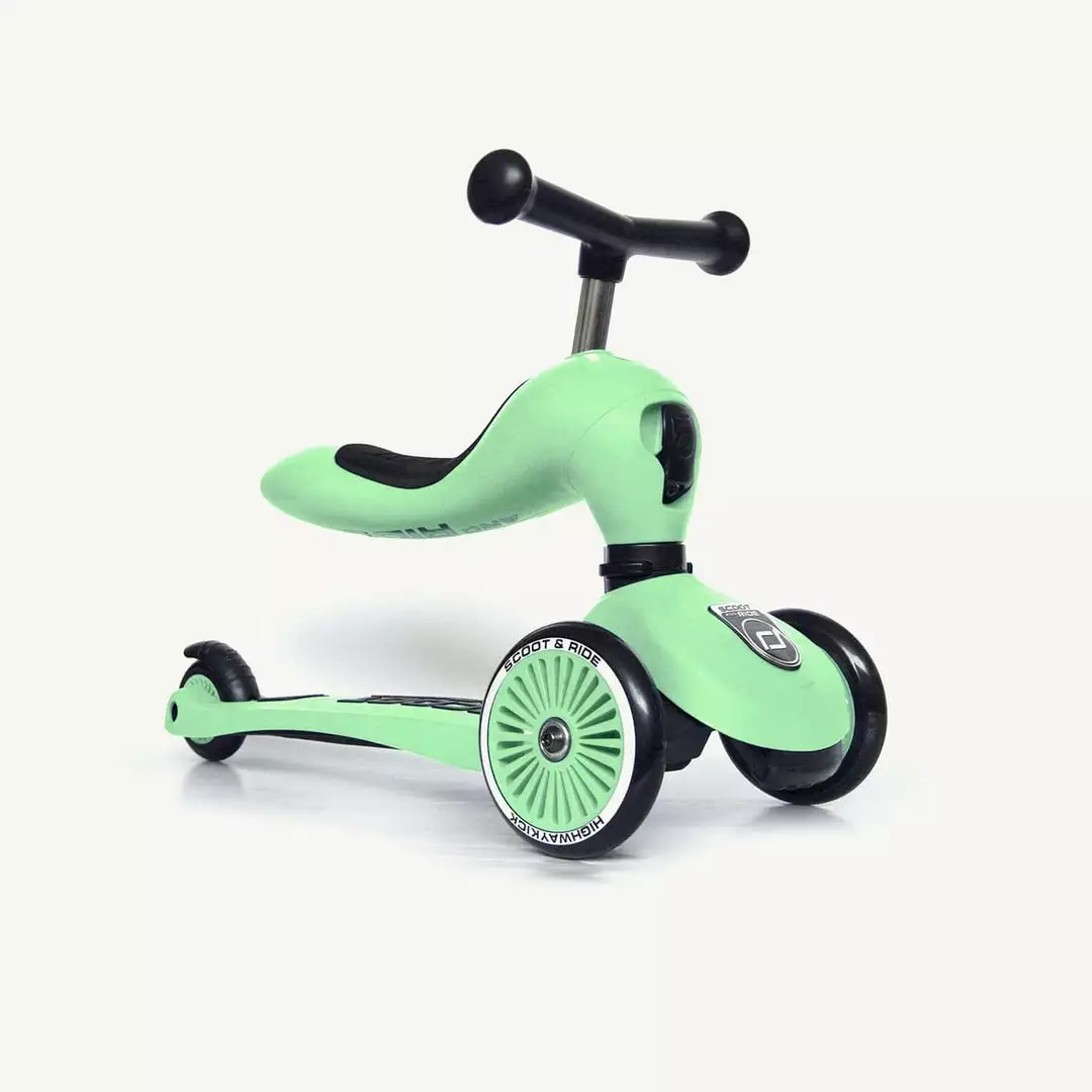 Scoot and Ride’s Highwaykick 1 is the perfect companion for children aged from 1 to 5 years . Thanks to its stability, 2 front wheels and 1 rear wheel, it allows even the youngest children to move, sitting safely and comfortably. The Highwaykick 1 is the first 2in1 kickboard / kickboard with seat that can be modified without the use of tools, worldwide. It has the lowest seat height of all kickboards available on the market. This seat height can be adjusted further without any tools and the safety pad at the front provides rollover protection, for additional safety.