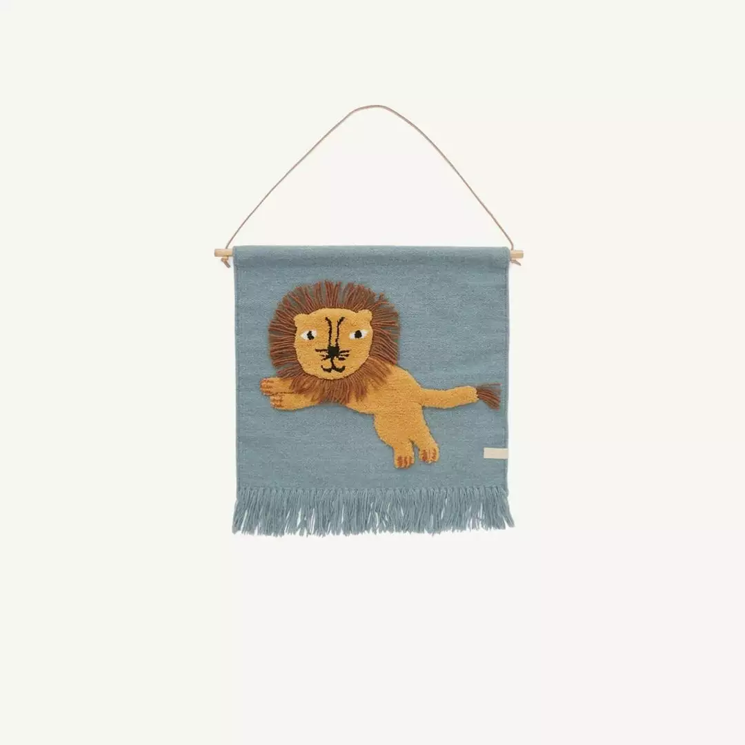 Jumping Lion Wallhanger by OIOI. This beautiful Jumping Lion Wallhanger is a lovely decorative piece for your child’s play room or bedroom. The playful collection which also includes a Giraffe and Tiger make a beautiful eye catching feature whether hung individually or grouped together. The soft muted colours blend beautifully in the home, giving it a lovely warm feeling, perfect for animal themed rooms and mixing other animal accessories!