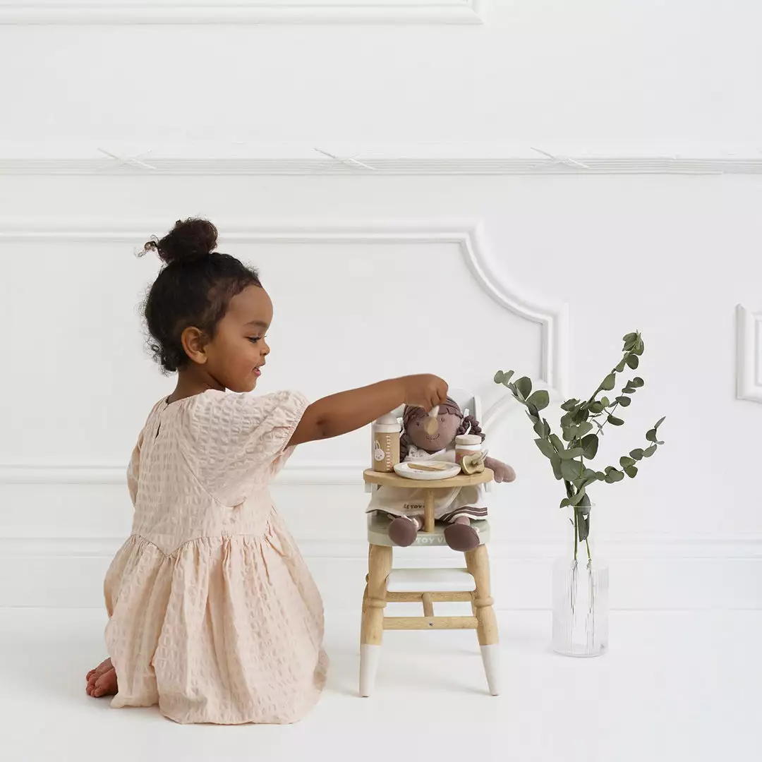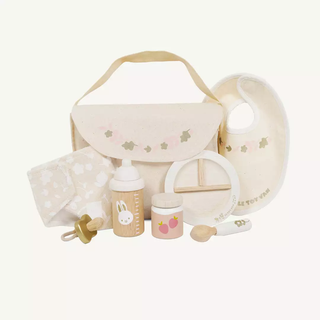Doll Nursing Set by Le Toy Van. A gorgeous baby set featuring a fabric bag with feeding and changing accessories. The 8-piece set consists of a bib, dummy, nappy, plate, spoon, baby food, bottle, and bag. Made from a combination of natural cotton and beautiful exposed solid wood. Decorated in delicate pastels with a flourish of golden paint. Scaled to dolls and soft toys 30-35cm.
