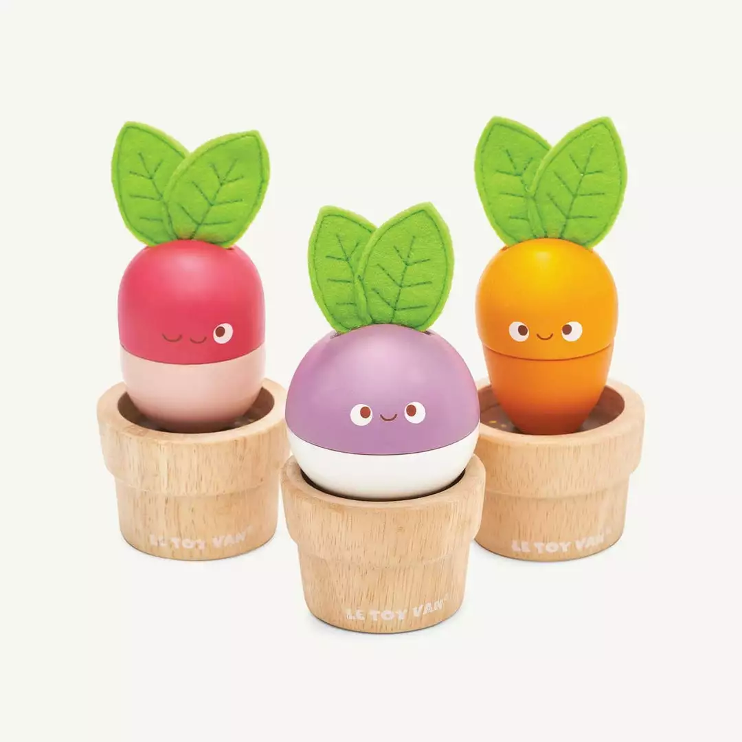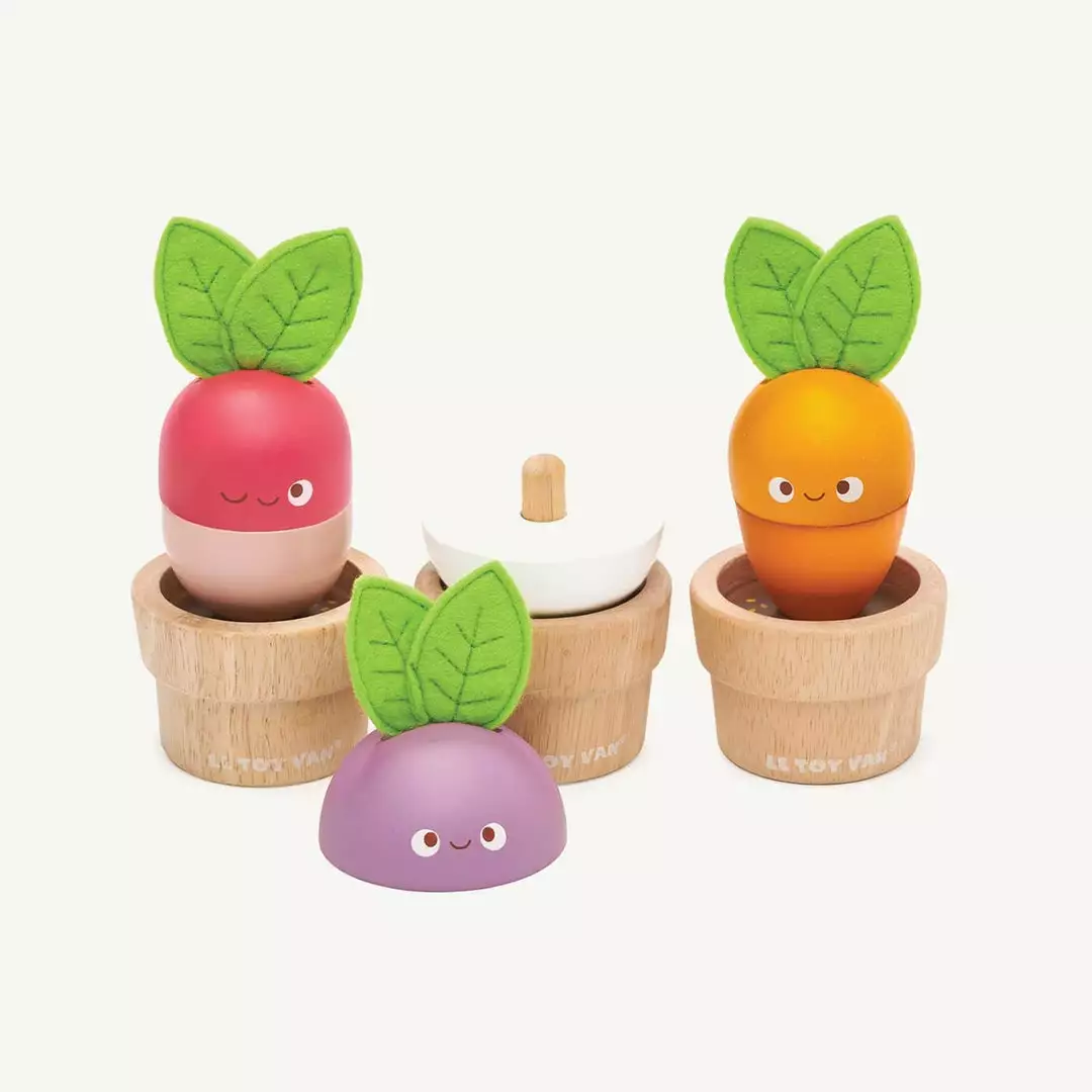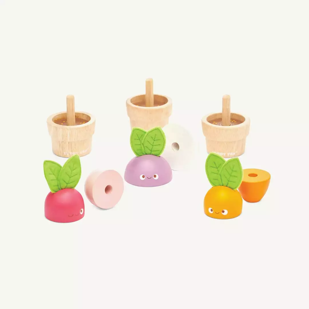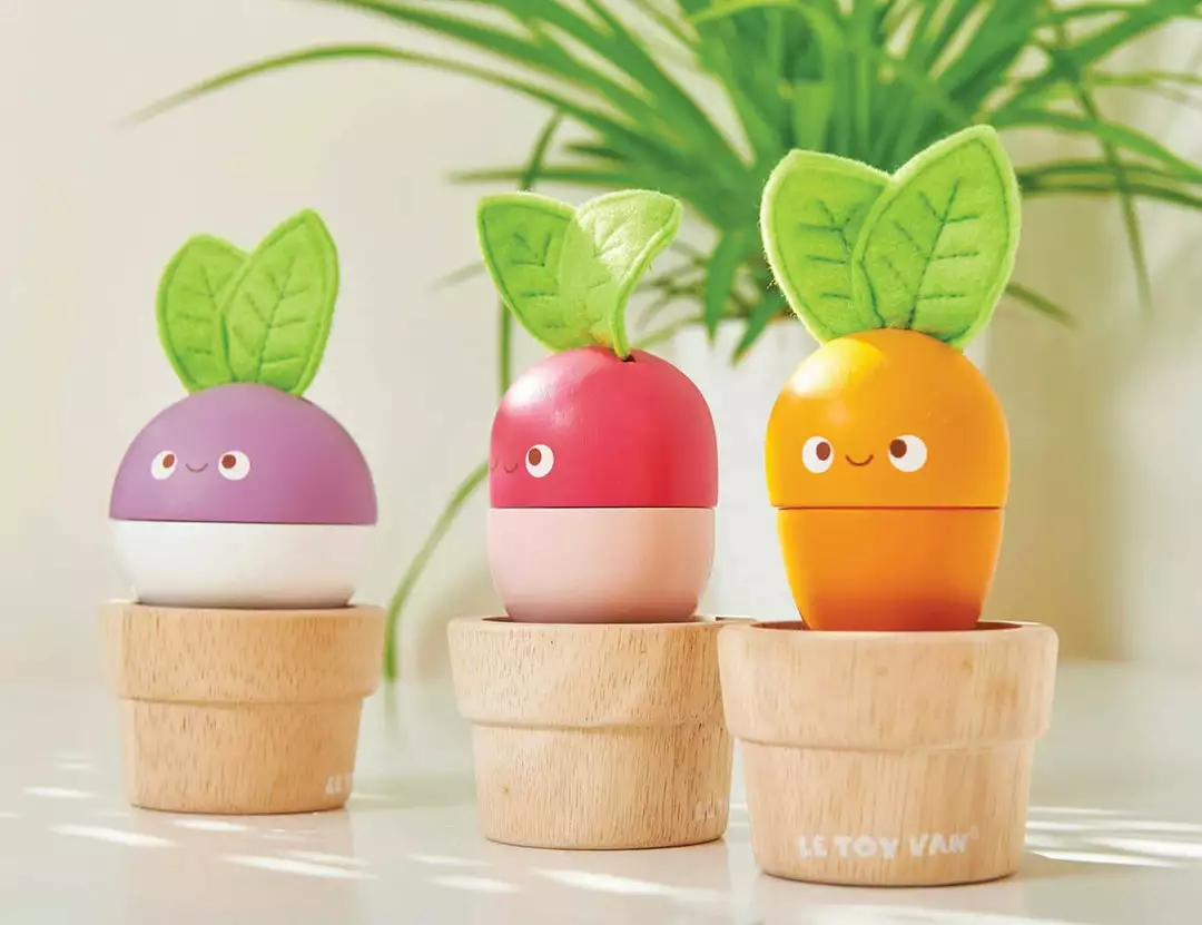 Petilou ‘Stacking Veggies’ wooden stacking toy by Le Toy Van. An adorable and quirky set of three happy wooden vegetables in their natural wood pots. Includes six detachable interchangeable stacking parts. Mix and match to create a carrot, beetroot and radish. Made from solid and smooth replenishable rubber wood and finished in gorgeous water based colours with beautifully hand sewn fabric leaves.