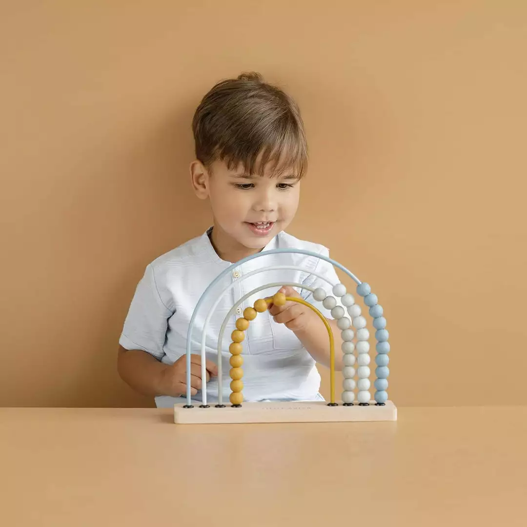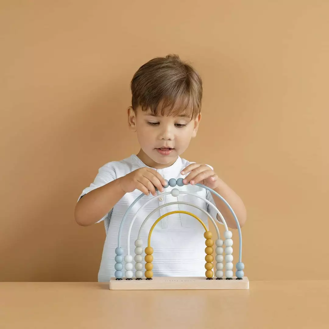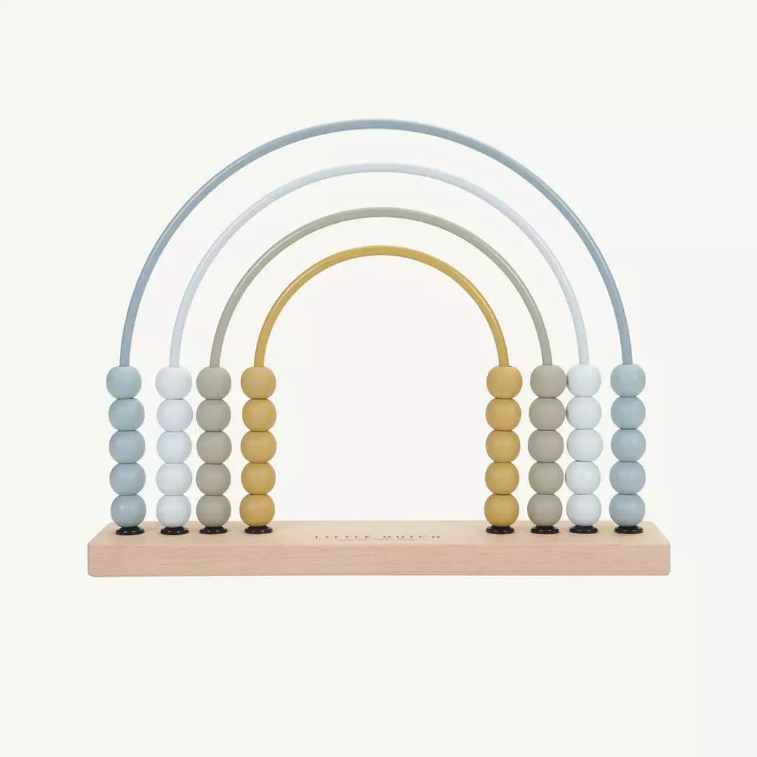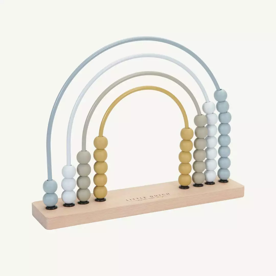 Wooden Rainbow Abacus in Blue by the brilliant Little Dutch. A classic toy, given a modern twist, this gorgeous Rainbow Abacus is a lovely addition to any playroom or living room. The rainbow is made of coloured metal arches on a wooden base with 10 wooden beads on each arch. This is a lovely educational toy that makes learning maths fun and helps your child develop skills in recognising patterns and colours, while honing fine motor skills.Â