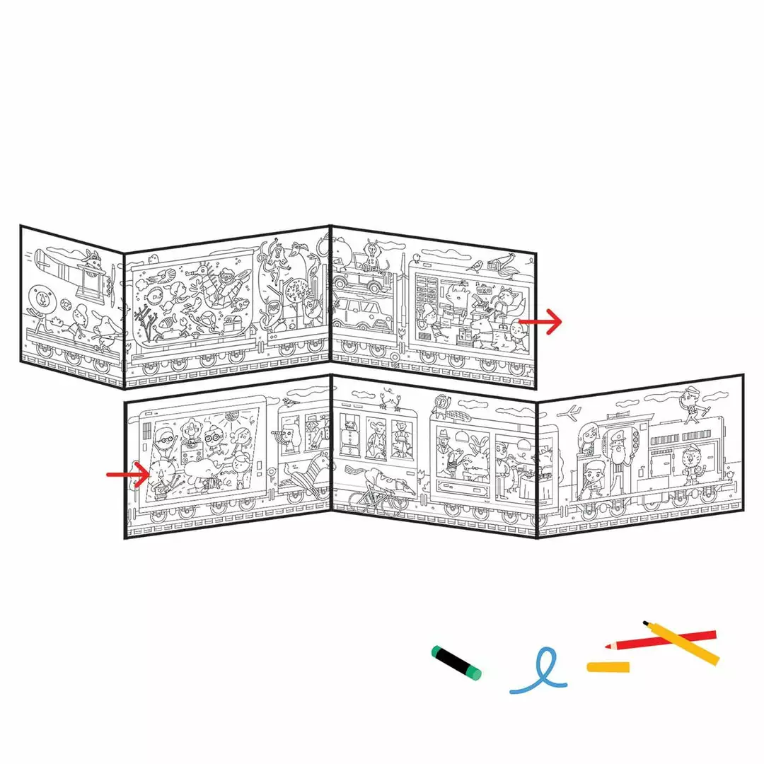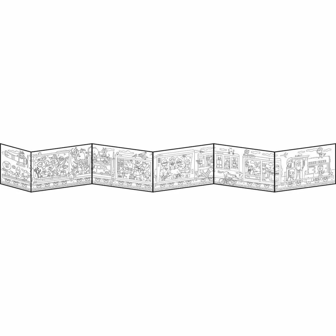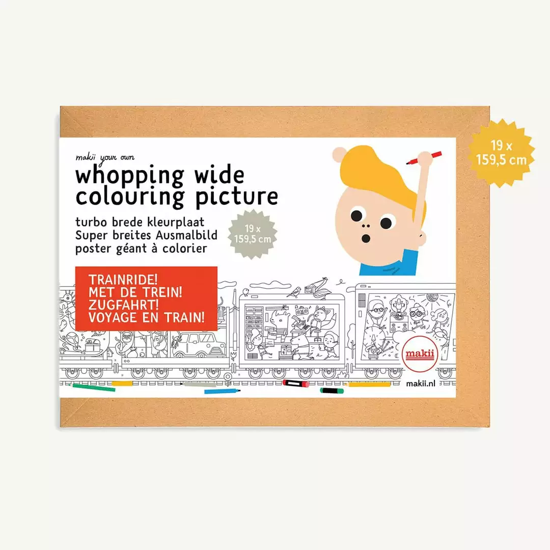 Makii Whopping Wide ‘Train Ride’ Colouring Picture A giant colouring picture full of crazy and colourful characters which folds out from A4 size to a whopping 159.5 cm! Grab your colouring pencils and get your family and friends to join. Take a look in carriage two, help sort the mail, take a dive in carriage seven and play cards with mister boar. This huge colouring picture will keep the kids busy for hours!