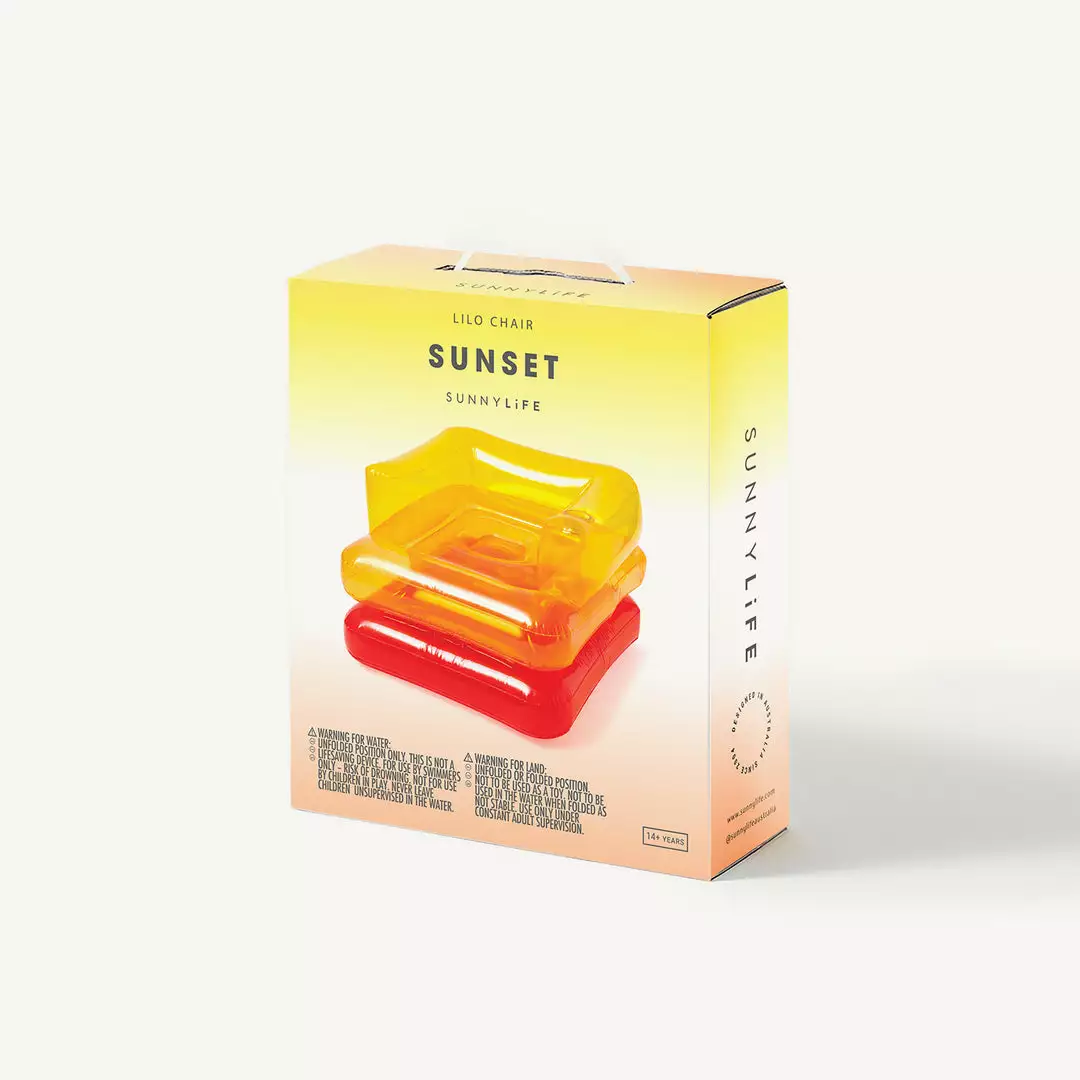 Inflatable Lilo Chair Sunset by Sunnylife. Summer is more fun with SUNNYLiFE! The versatile floating chair and recliner is guaranteed to inflate summer memories. This Insta-good float is the ultimate pool party pleaser for those who like to pump up the volume. Perfect for those warm sunny days at the Pool, Sunnylife’s Pool Floats are made from durable, non-toxic Phthalate free PVC. Recommended for adults and children age 14 years +.