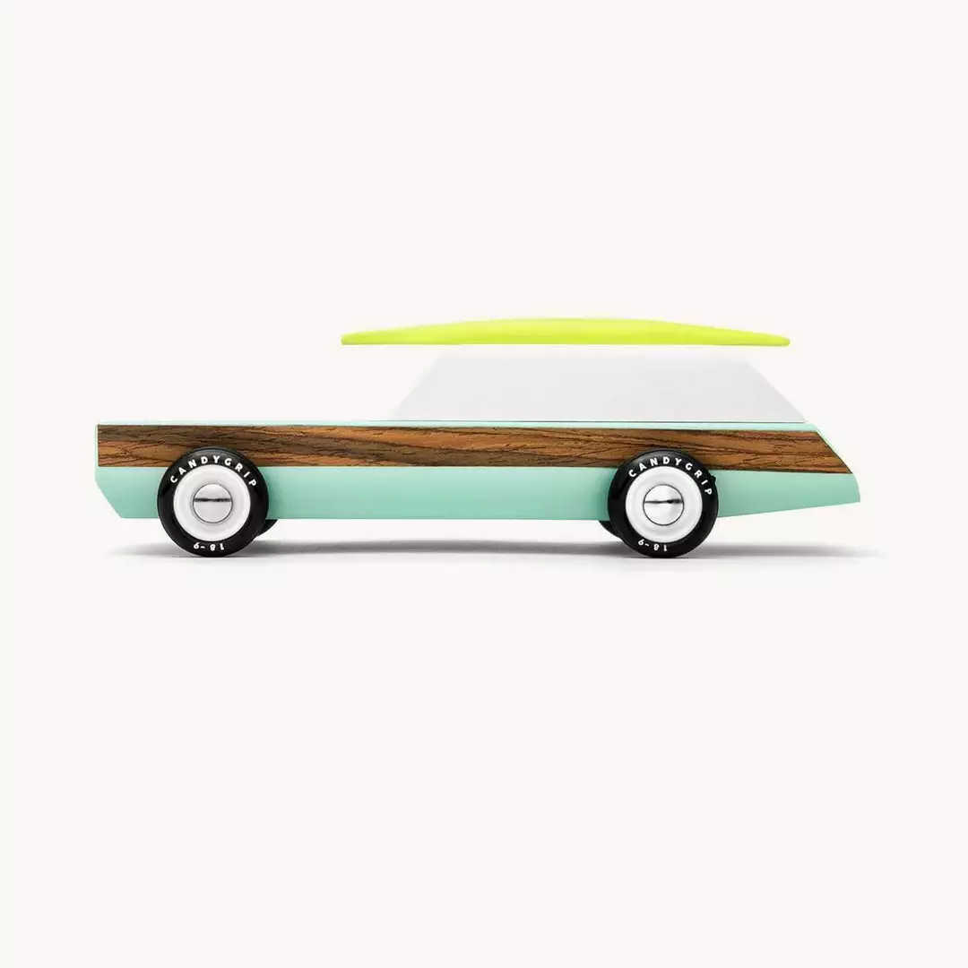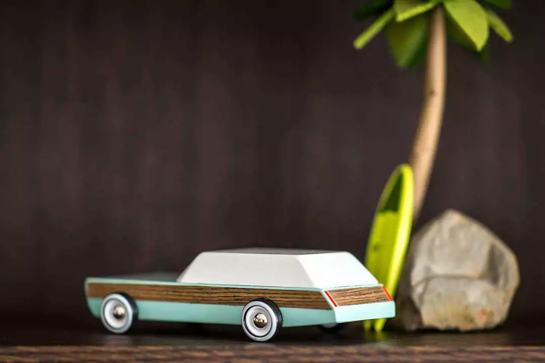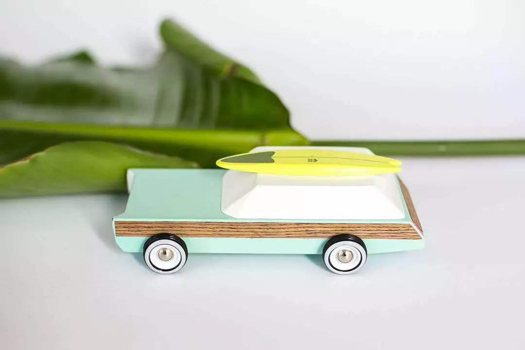 Woodie Redux toy vehicle and collectable by Candylab Toys. The famous classic, now in a boxier 80’s vibe. With real veneer-paneled sides, and a magnet embedded in the roof, it comes with a surfboard that snaps onto it. This car also features a magnetic tow hook – allowing it to hitch to Candylab’s Airstream camper and Blue Camper.