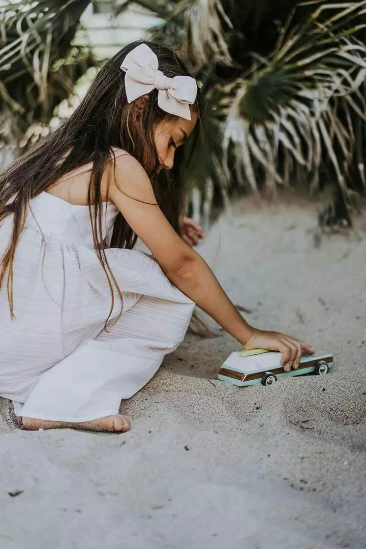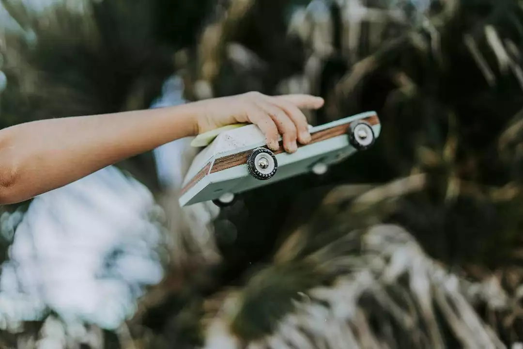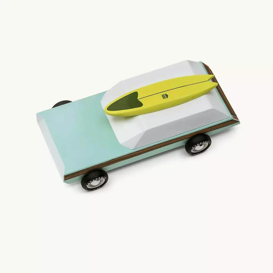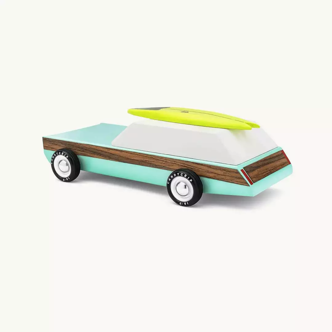 Woodie Redux toy vehicle and collectable by Candylab Toys. The famous classic, now in a boxier 80’s vibe. With real veneer-paneled sides, and a magnet embedded in the roof, it comes with a surfboard that snaps onto it. This car also features a magnetic tow hook – allowing it to hitch to Candylab’s Airstream camper and Blue Camper.